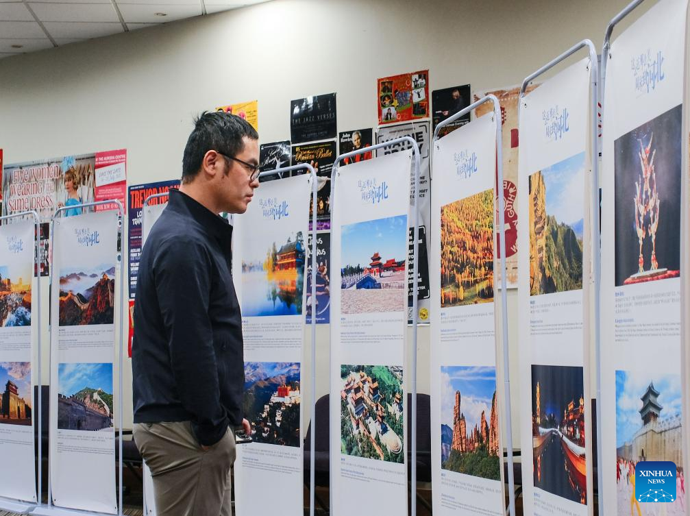 A man visits the "Encounter Hebei" photo exhibition during a cultural tourism promotion event of China's Hebei Province in Christchurch, New Zealand, March 3, 2025. China's Hebei Province promoted cultural tourism in New Zealand's South Island on Monday, showing local audience acrobatics, Hebei bangzi, a genre of Chinese opera, and other folk culture performances.