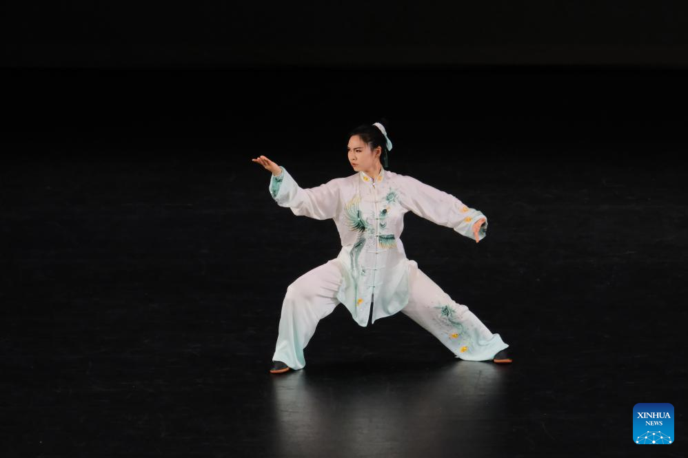 A martial artist performs during a cultural tourism promotion event of China's Hebei Province in Christchurch, New Zealand, March 3, 2025. China's Hebei Province promoted cultural tourism in New Zealand's South Island on Monday, showing local audience acrobatics, Hebei bangzi, a genre of Chinese opera, and other folk culture performances.