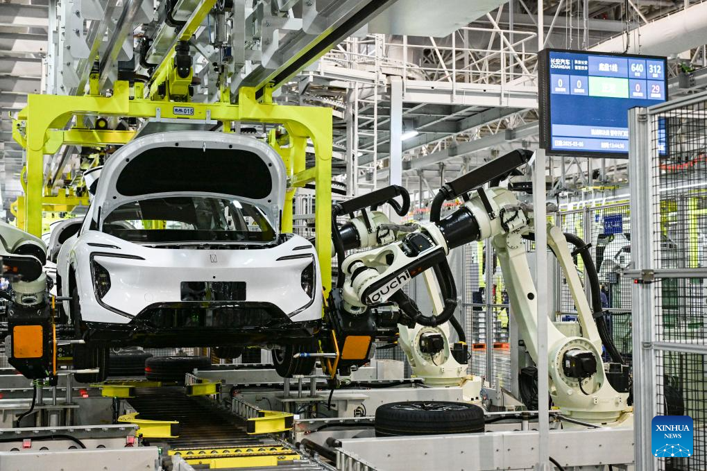 With the goal of digitalizing the whole manufacturing process, Chang'an Auto Digital Intelligence Factory has applied more than 40 advanced technologies such as 5G, artificial intelligence, and digital twins. The factory has gained the production capacity of quickly switching different vehicle models and realized collinear production of multi-brands and multi-power types of vehicles, which not only improves its production efficiency, but also enhances its ability to respond to changes in market demand. (Xinhua/Wang Quanchao)