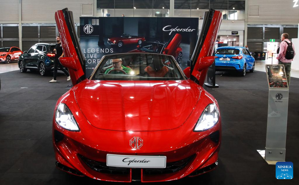 A visitor tries an MG Cyberster during the Everything Electric Australia, a home energy and electric vehicle show, in Sydney, Australia, March 7, 2025. The event will last three days till March 9. (Xinhua/Ma Ping)