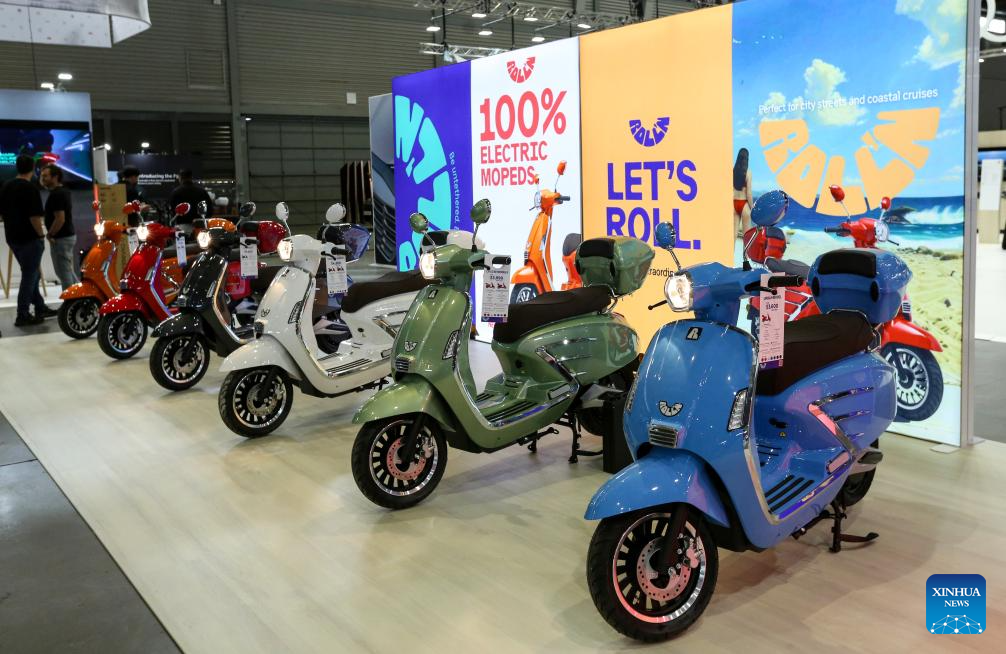 This photo shows electric motorbikes on display during the Everything Electric Australia, a home energy and electric vehicle show, in Sydney, Australia, March 7, 2025. The event will last three days till March 9. (Xinhua/Ma Ping)