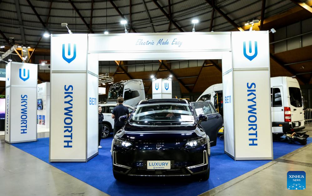 This photo shows the exhibition stand for Skyworth during the Everything Electric Australia, a home energy and electric vehicle show, in Sydney, Australia, March 7, 2025. The event will last three days till March 9. (Xinhua/Ma Ping)
