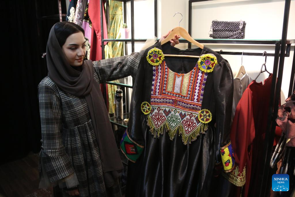 Bahara Salimi, a clothing store saleswoman, showcases a costume at her workplace in Kabul, the capital of Afghanistan, Feb. 16, 2025. (Photo by Saifurahman Safi/Xinhua)