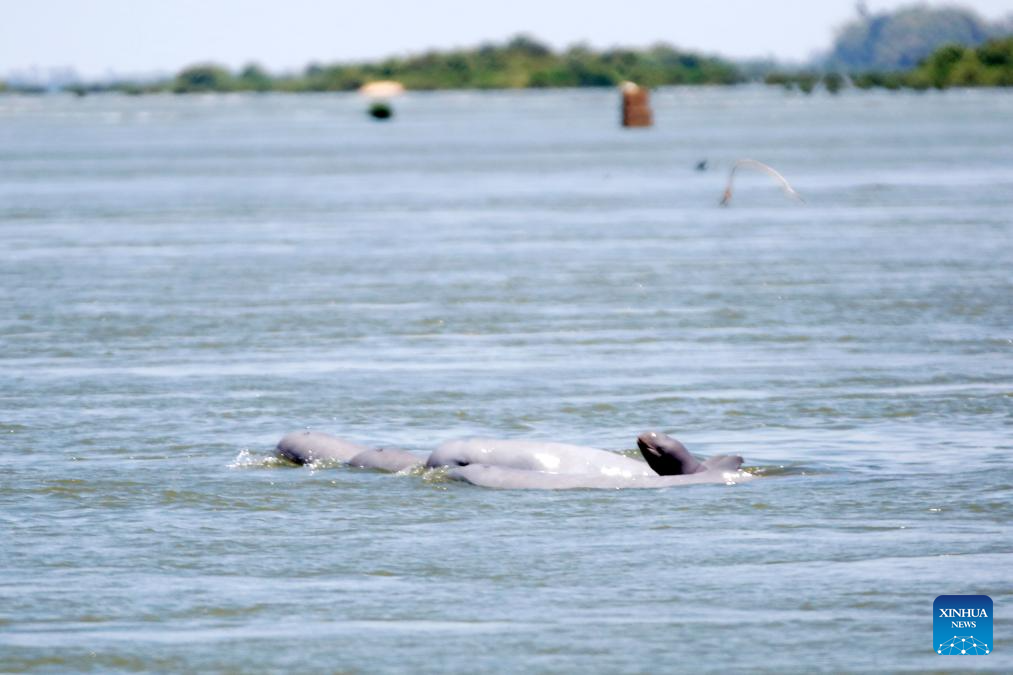 Mekong Irrawaddy dolphins swim in the Mekong River in Kratie province, Cambodia, on March 8, 2025. The Mekong Irrawaddy dolphins have been listed as critically endangered on the International Union for Conservation of Nature (IUCN) Red List of Threatened Species since 2004. (Photo by Sovannara/Xinhua)