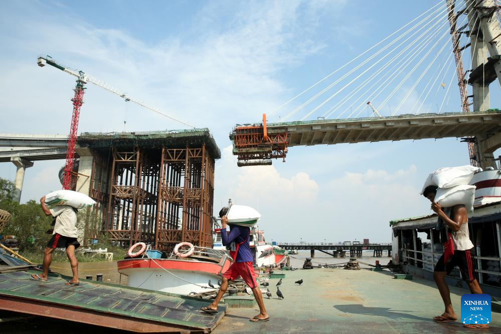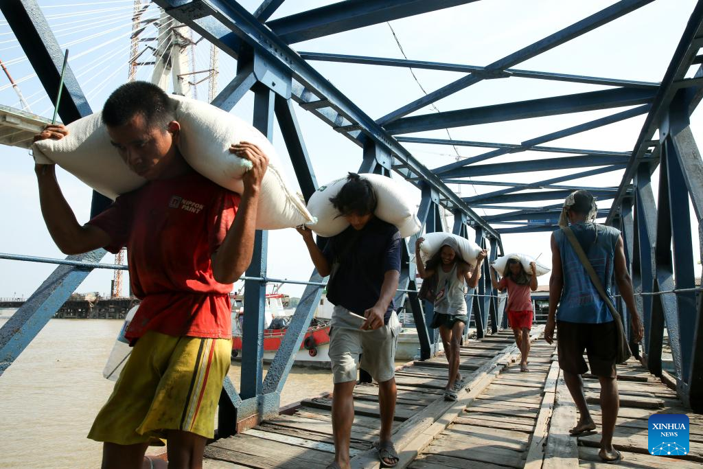 Workers unload bags of rice from a cargo boat at a jetty in Yangon, Myanmar, March 11, 2025. Myanmar's exports of rice and broken rice in the first 11 months of the 2024-25 fiscal year reached over 2.37 million tons, according to the Myanmar Rice Federation on Tuesday. (Xinhua/Myo Kyaw Soe)
