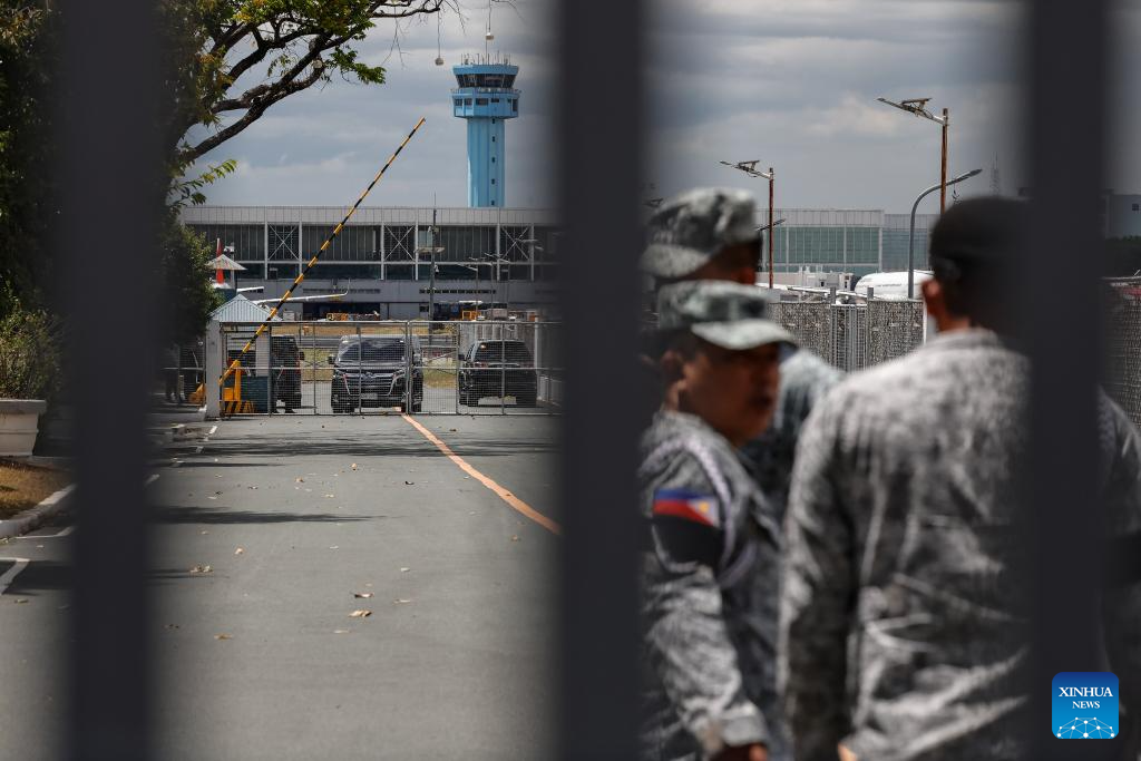 Soldiers gather to secure the area where former Philippine President Rodrigo Duterte is being held in the Villamor Airbase in Pasay City, Metro Manila, the Philippines, March 11, 2025. The Philippine Presidential Communications Office (PCO) issued a statement on Tuesday, confirming that former President Rodrigo Duterte was detained by police upon his return to Manila from abroad. (Xinhua/Stringer)