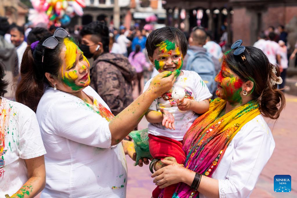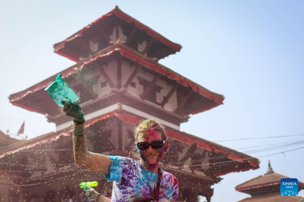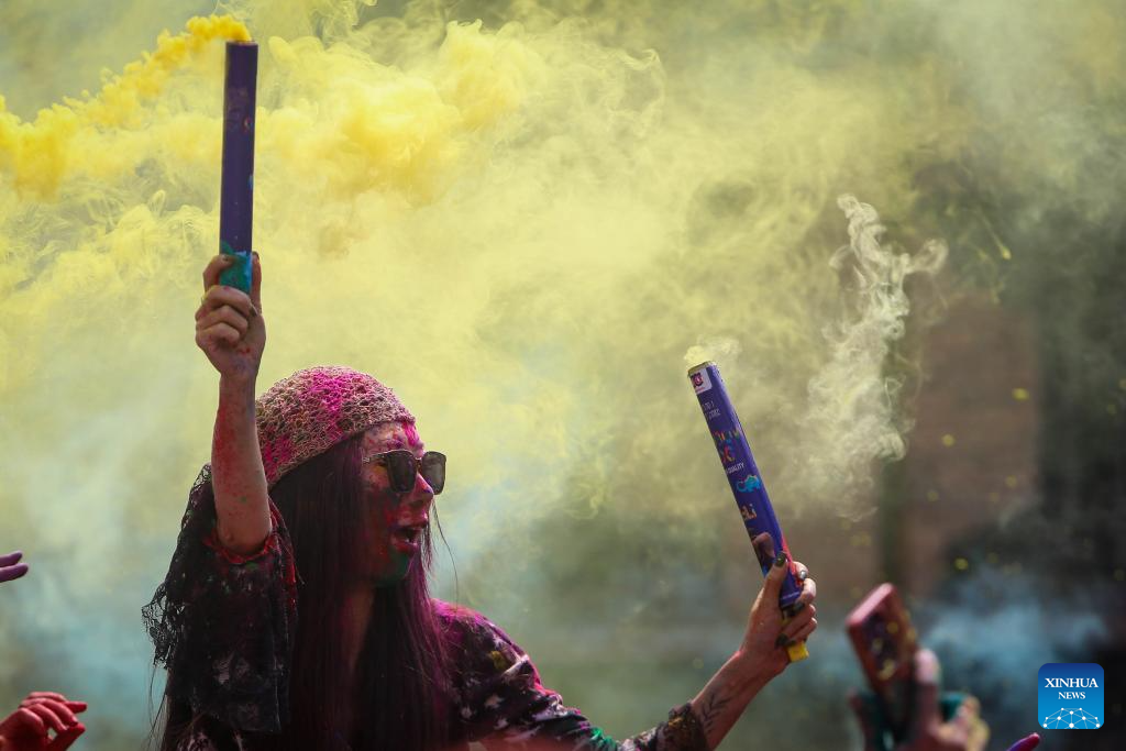 (250313) -- KATHMANDU, March 13, 2025 (Xinhua) -- People smeared with colored powder celebrate the Holi Festival in Kathmandu, Nepal, March 13, 2025. Holi, the festival of colors, marks the end of winter and the onset of the spring season. (Photo by Sulav Shrestha/Xinhua)
