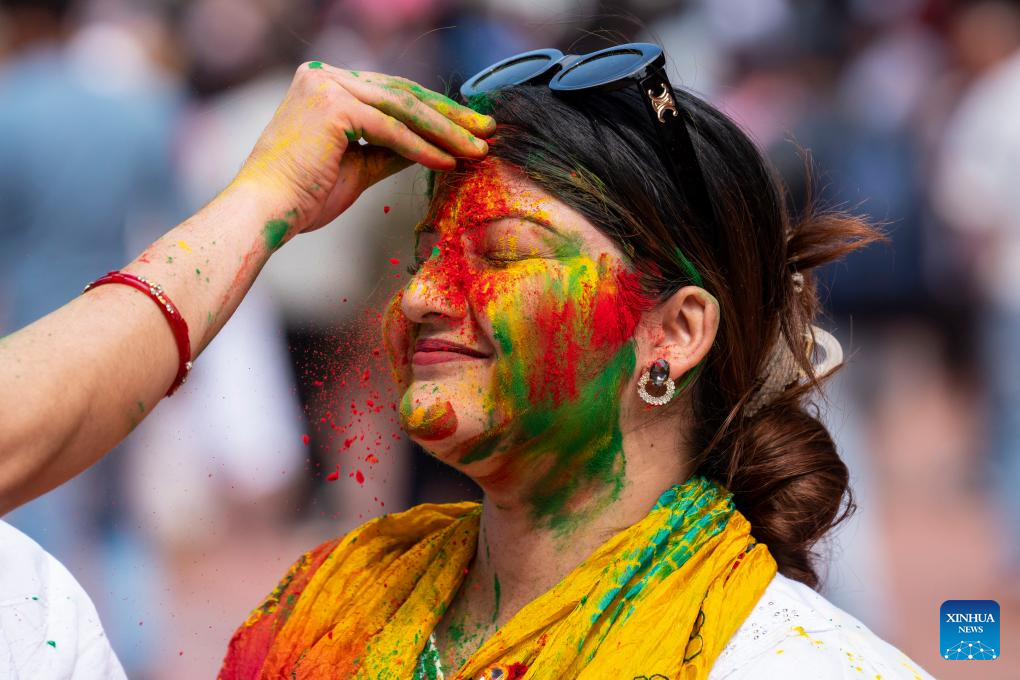 A woman smeared with colored powder celebrates the Holi Festival in Lalitpur, Nepal, March 13, 2025. Holi, the festival of colors, marks the end of winter and the onset of the spring season. (Photo by Hari Maharjan/Xinhua)