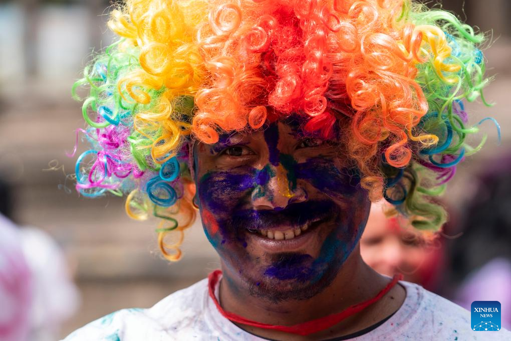 A man smeared with colored powder celebrates the Holi Festival in Lalitpur, Nepal, March 13, 2025. Holi, the festival of colors, marks the end of winter and the onset of the spring season. (Photo by Hari Maharjan/Xinhua)