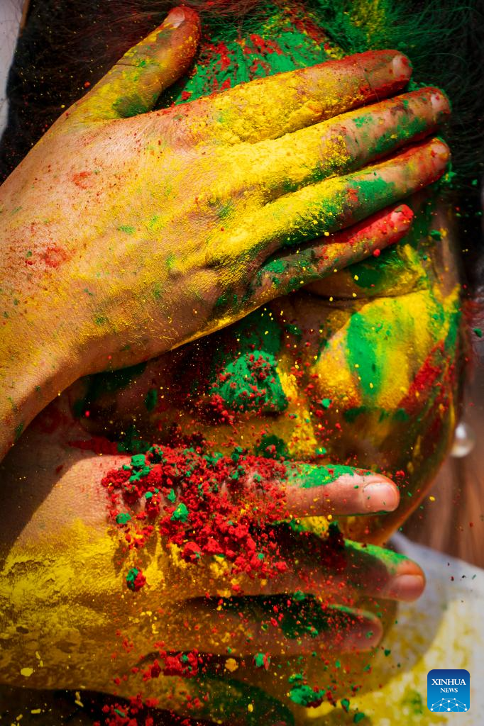 (250313) -- KATHMANDU, March 13, 2025 (Xinhua) -- A woman smeared with colored powder celebrates the Holi Festival in Kathmandu, Nepal, March 13, 2025. Holi, the festival of colors, marks the end of winter and the onset of the spring season. (Photo by Sulav Shrestha/Xinhua)