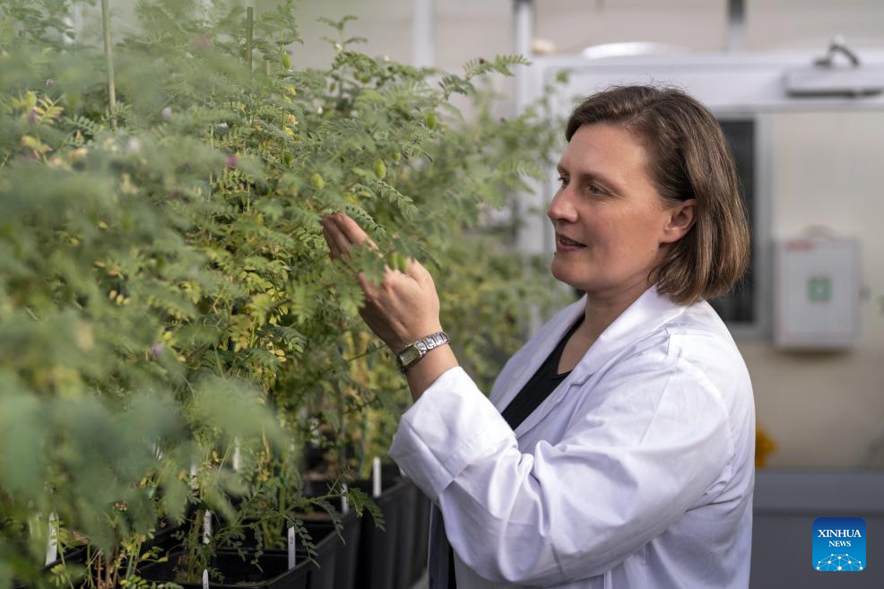 Caitlin Byrt checks plants that can be used in the extraction of critical resources in Canberra, Australia, on Aug. 29, 2024. (Jamie Kidston/ANU/Handout via Xinhua)
