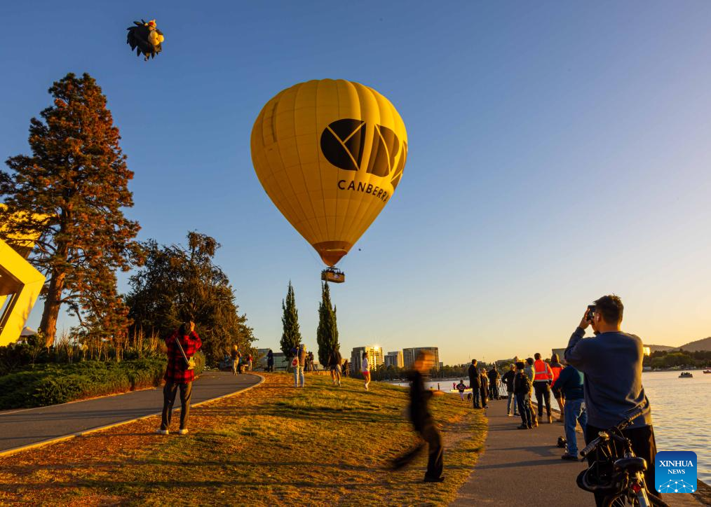 A hot air balloon flies in the sky during the annual Canberra Balloon Spectacular in Canberra, Australia, March 18, 2025. (Photo by Chu Chen/Xinhua)