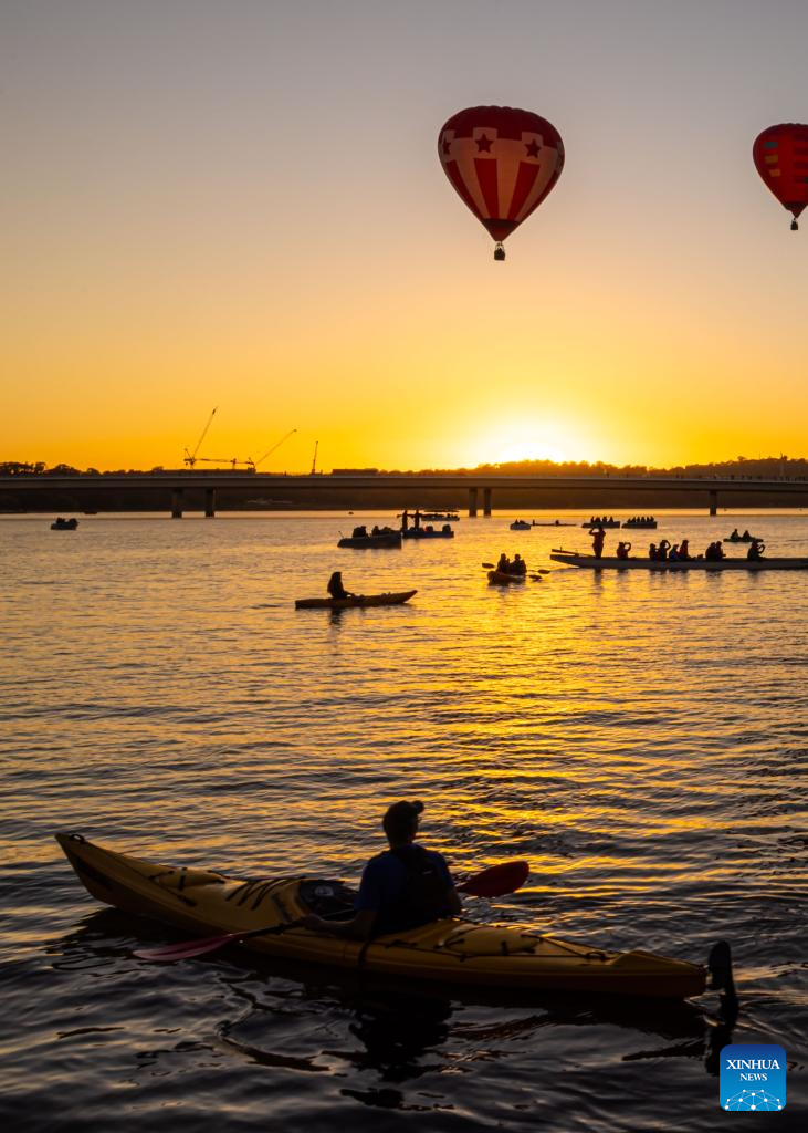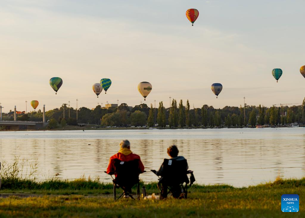 Hot air balloons fly over the Lake Burley Griffin during the annual Canberra Balloon Spectacular in Canberra, Australia, March 18, 2025. (Photo by Chu Chen/Xinhua)