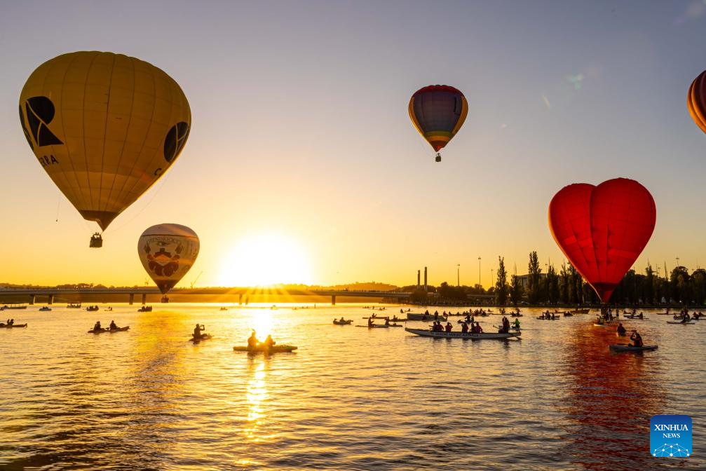 Hot air balloons fly over the Lake Burley Griffin during the annual Canberra Balloon Spectacular in Canberra, Australia, March 15, 2025. (Photo by Chu Chen/Xinhua)