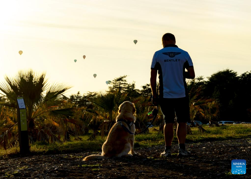 A person and his dog watch the hot air balloons in the sky during the annual Canberra Balloon Spectacular in Canberra, Australia, March 15, 2025. (Photo by Chu Chen/Xinhua)