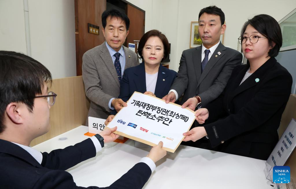 Members of South Korea's opposition parties submit an impeachment motion against Choi Sang-mok, deputy prime minister for economic affairs who became acting president in December last year following the impeachments of both president and prime minister, in Seoul, South Korea, March 21, 2025. The main liberal opposition Democratic Party and four other minor parties submitted the impeachment motion for four reasons, including Choi's alleged involvement in the impeached President Yoon Suk-yeol's botched martial law imposition and his refusal to appoint a constitutional court justice for over three weeks. (NEWSIS via Xinhua)
