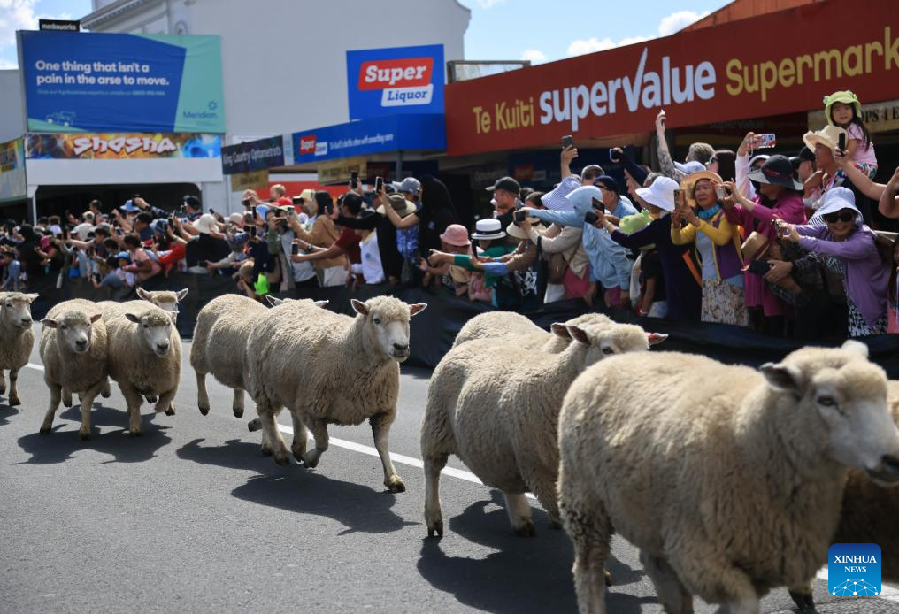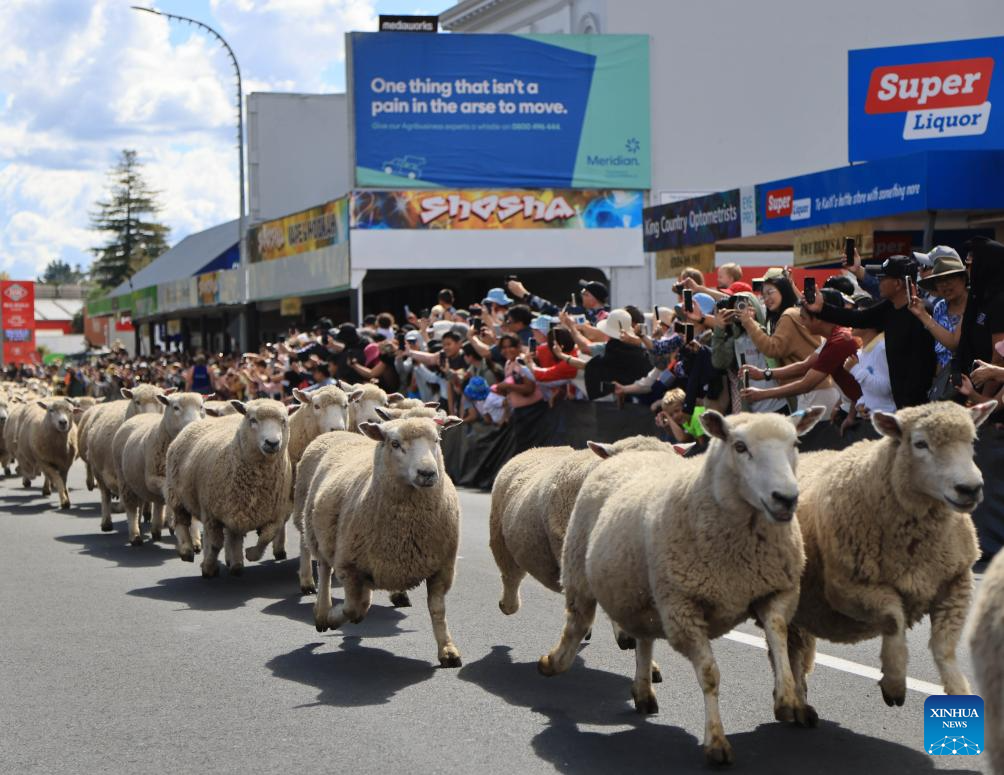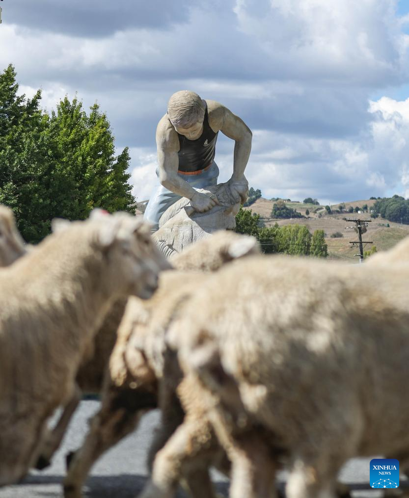 Sheep pass a statue at the Great New Zealand Muster in Te Kuiti, New Zealand, March 29, 2025. (Xinhua/Long Lei)