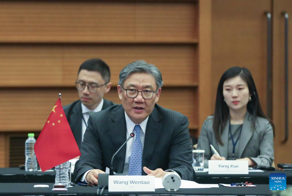 Chinese Commerce Minister Wang Wentao speaks at the 13th China-Japan-ROK Trilateral Economic and Trade Ministers' Meeting in Seoul, South Korea, March 30, 2025. The trilateral meeting, focused on topics such as strengthening trade and investment collaboration and advancing regional and multilateral cooperation, was co-chaired by Wang Wentao, Minister of Trade, Industry and Energy of the Republic of Korea (ROK) Ahn Duk-geun, and Japanese Minister of Economy, Trade and Industry Yoji Muto. (Xinhua/Yao Qilin)