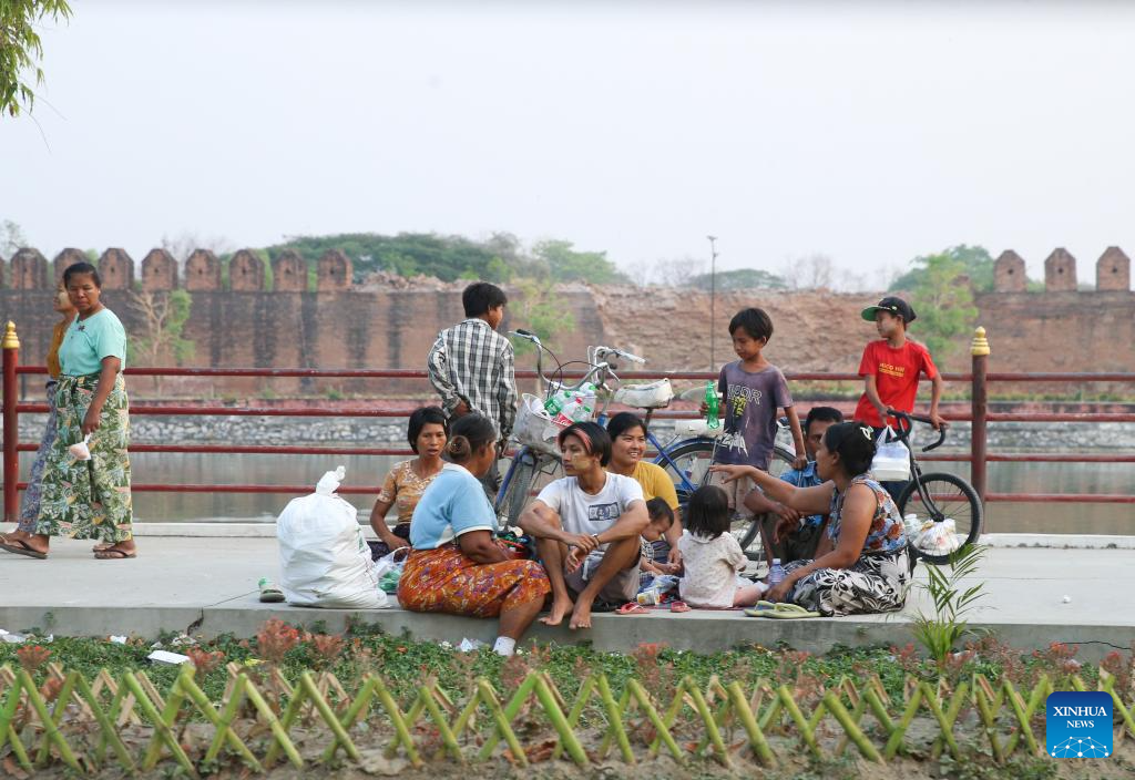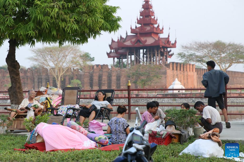 People take shelter near the Mandalay Palace in Mandalay, Myanmar, April 1, 2025. The death toll from Friday's devastating earthquake in Myanmar has reached 2,719, with 4,521 people injured and 441 others still missing. (Photo by Myo Kyaw Soe/Xinhua)