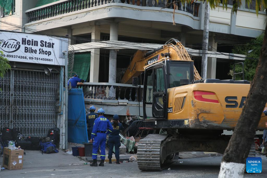 Members of Blue Sky Rescue, a Chinese civil relief squad, carry out rescue work at a quake site in Mandalay, Myanmar, April 1, 2025. The death toll from Friday's devastating earthquake in Myanmar has reached 2,719, with 4,521 people injured and 441 others still missing. (Photo by Myo Kyaw Soe/Xinhua)