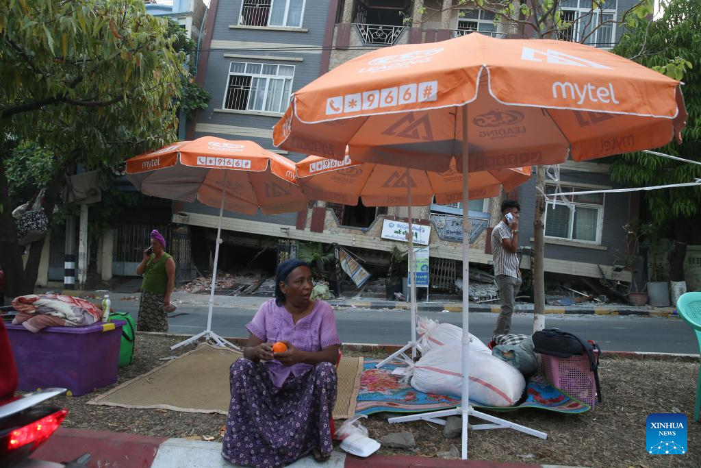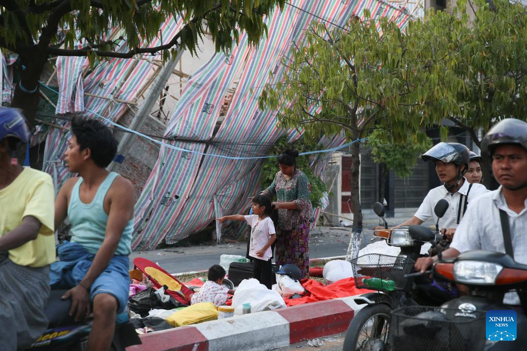 People take shelter in the street in Mandalay, Myanmar, April 1, 2025. The death toll from Friday's devastating earthquake in Myanmar has reached 2,719, with 4,521 people injured and 441 others still missing. (Photo by Myo Kyaw Soe/Xinhua)