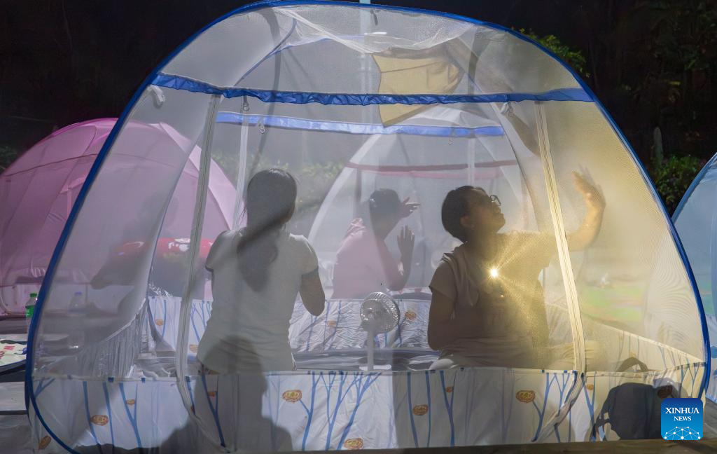 People swat mosquitoes in mosquito nets in Mandalay, Myanmar, March 31, 2025. The weather in Mandalay is hot recently, and the temperature can reach 40 degrees Celsius during the day. (Xinhua/Cai Yang)