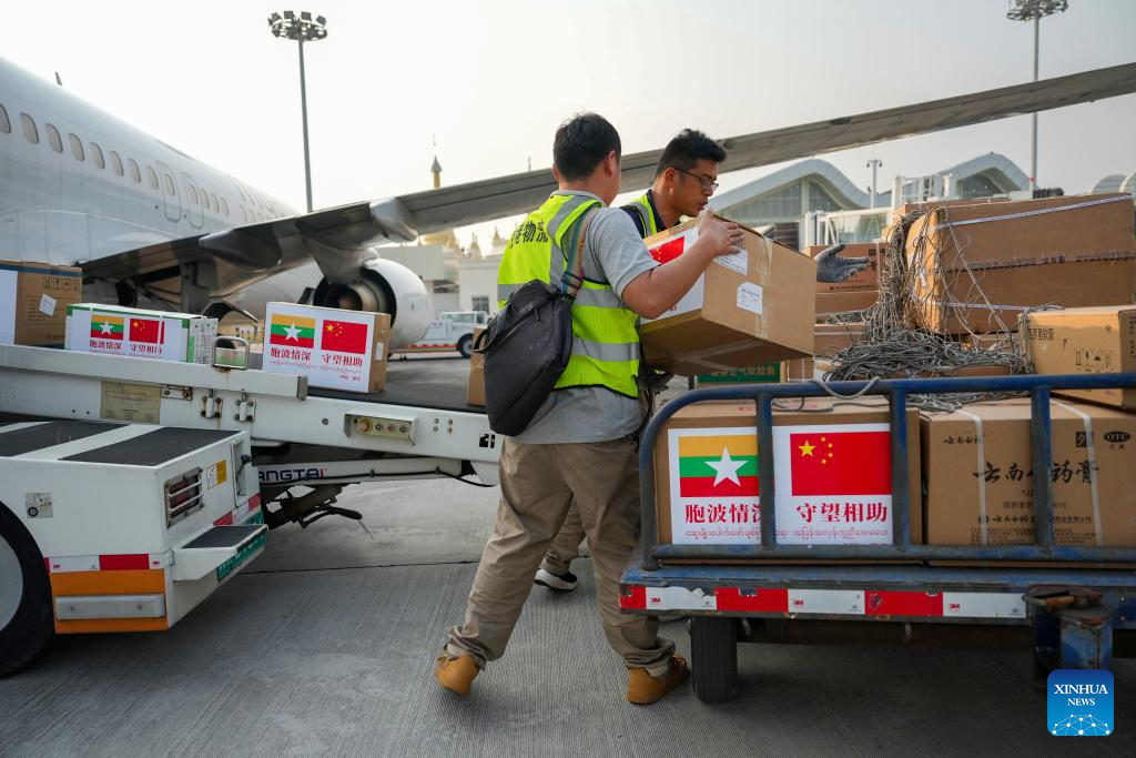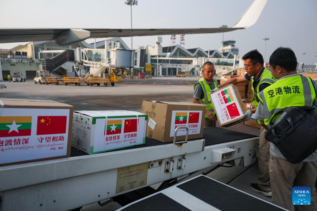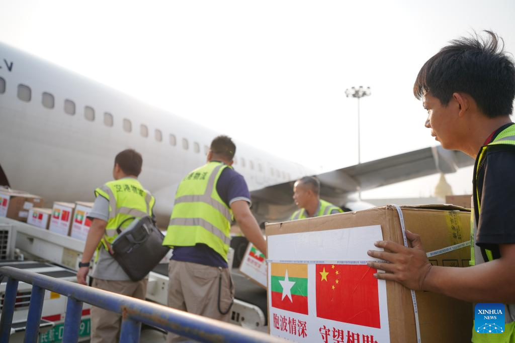 Staff members load donated medical supplies onto a plane at Dehong Mangshi Airport in Mangshi City, Dehong Dai and Jingpo Autonomous Prefecture, southwest China's Yunnan Province, April 1, 2025.