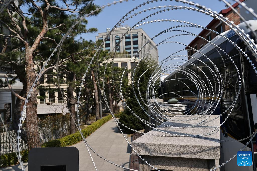 This photo taken on April 3, 2025 shows barbed wire atop the walls of the constitutional court in Seoul, South Korea. South Korean President Yoon Suk-yeol and his country are at a turning point as the country's constitutional court has announced that it will deliver its verdict on the impeachment against the president on Friday.