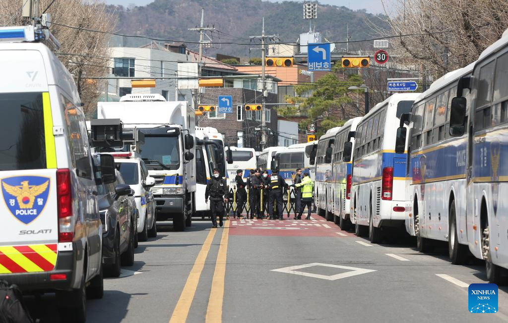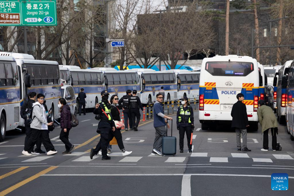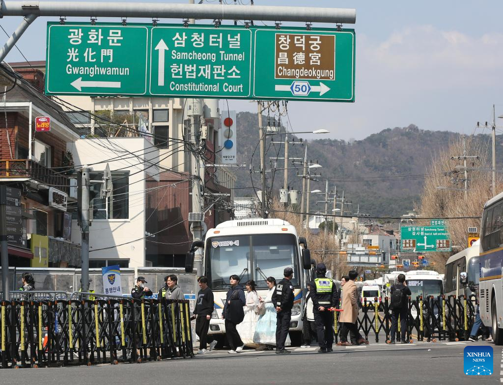 Police vehicles are stationed near the constitutional court in Seoul, South Korea, April 3, 2025. South Korean President Yoon Suk-yeol and his country are at a turning point as the country's constitutional court has announced that it will deliver its verdict on the impeachment against the president on Friday. Yoon Suk-yeol has decided not to attend the constitutional court's ruling on his impeachment scheduled for Friday. (Photo by Jun Hyosang/Xinhua)