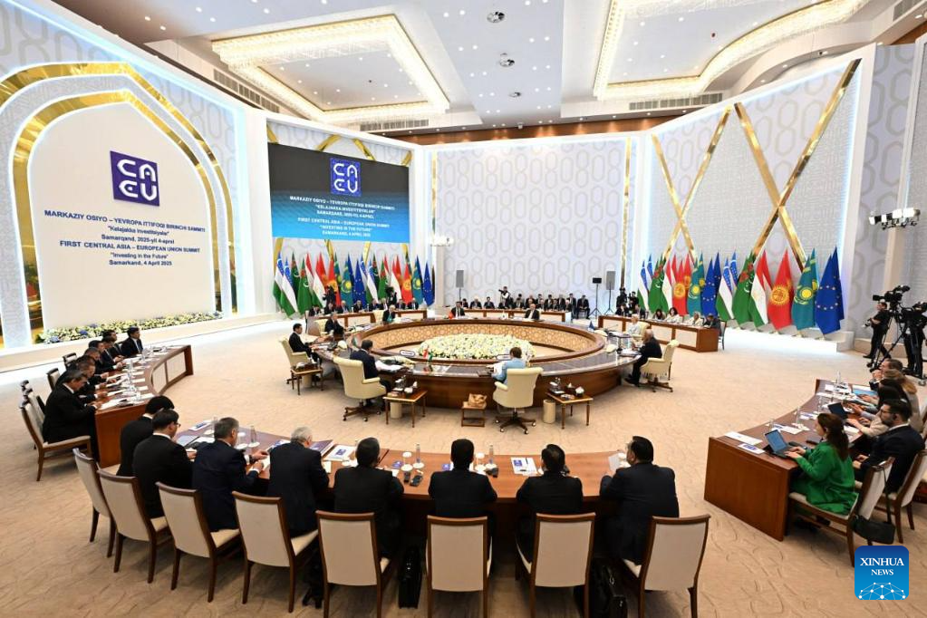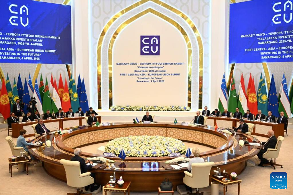 This photo taken on April 4, 2025 shows a scene during the first Central Asia-EU summit in Samarkand, Uzbekistan. The first Central Asia-EU summit, chaired by Uzbek President Shavkat Mirziyoyev, was held in the Uzbek city on Friday, according to the presidential press service. (Press Service of the Uzbek President/Handout via Xinhua)