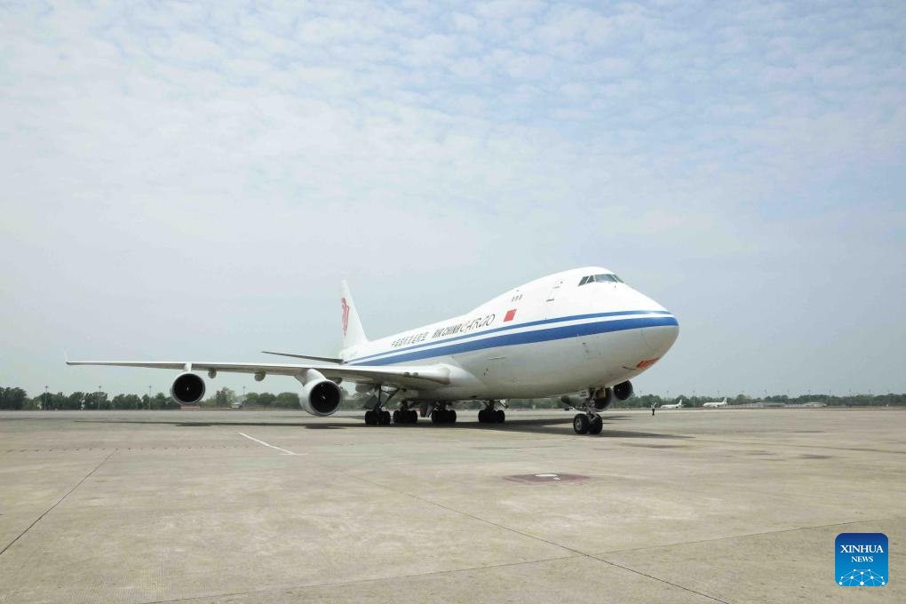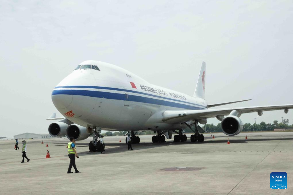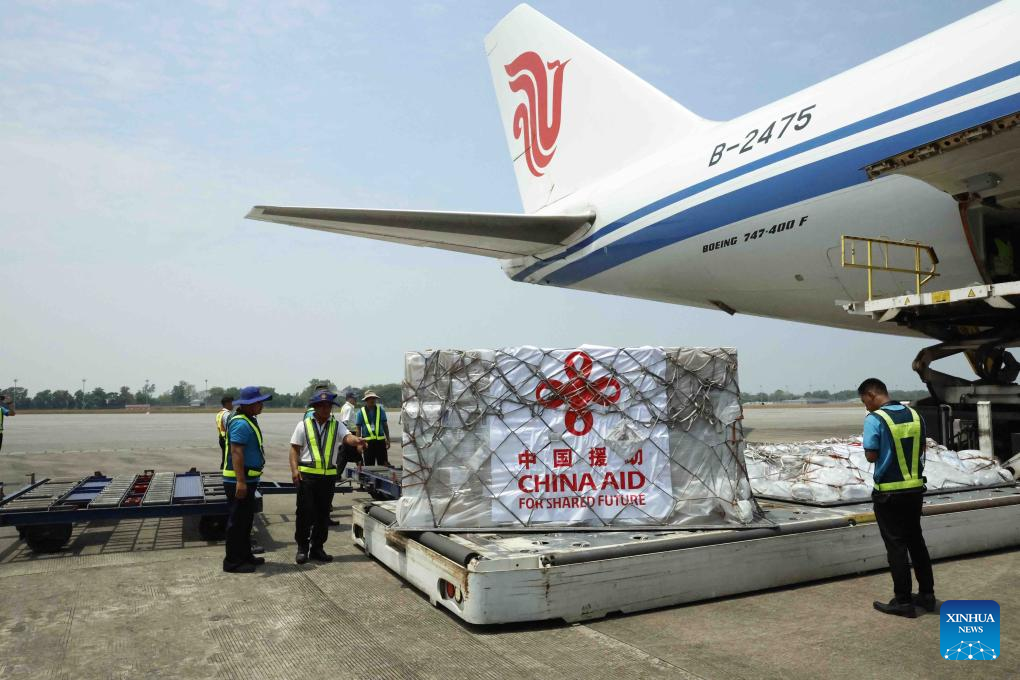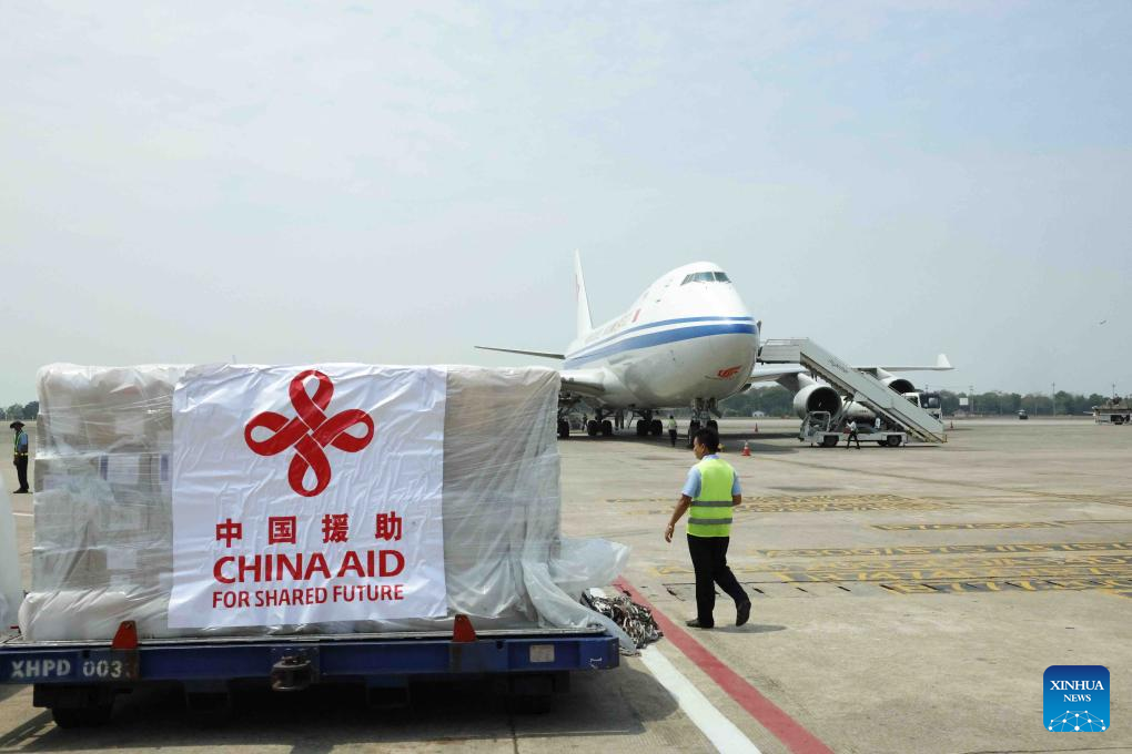 The third batch of emergency humanitarian aid supplies for earthquake disaster relief dispatched by the Chinese government arrives at Yangon International Airport in Yangon, Myanmar, April 5, 2025. (Photo by Haymhan Aung/Xinhua)