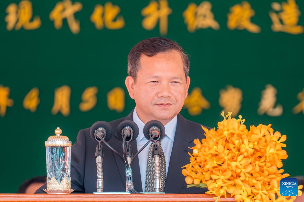 Cambodian Prime Minister Hun Manet speaks during the inauguration ceremony of a Cambodia-China Joint Support and Training Center in Sihanoukville, Cambodia, on April 5, 2025. A Cambodia-China Joint Support and Training Center at Port Ream here in southwestern Cambodia was put into operation on Saturday. (Photo by Nitola/Xinhua)