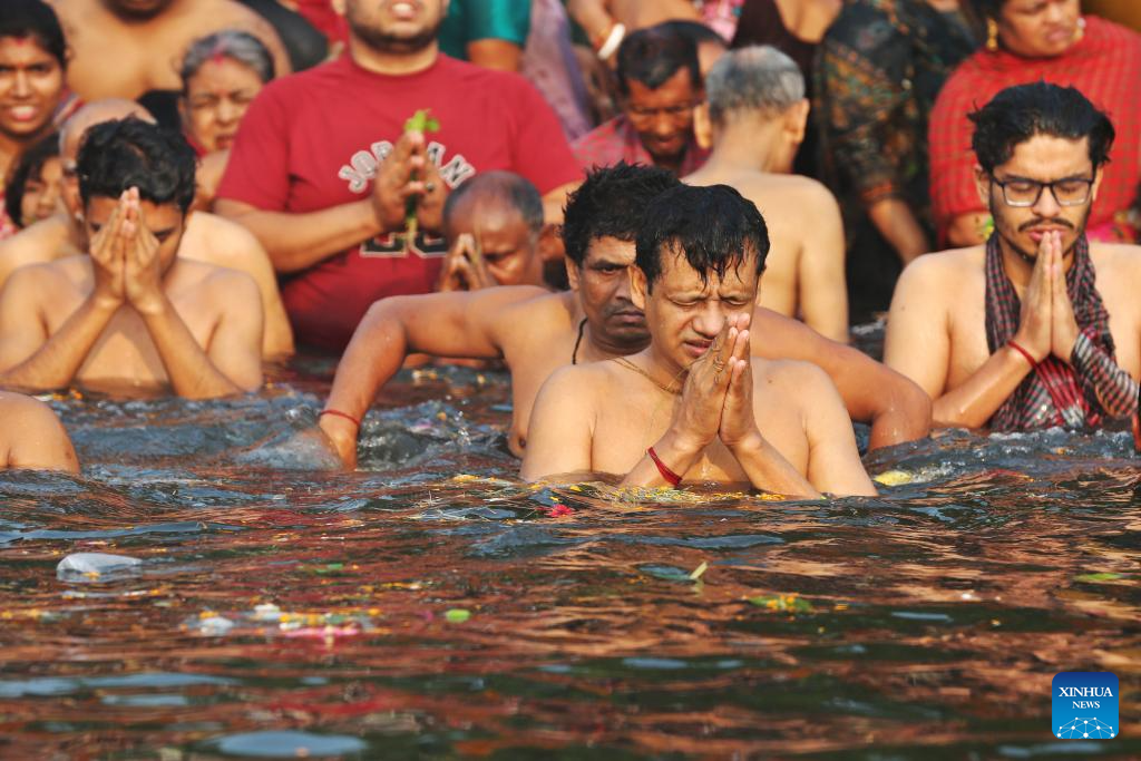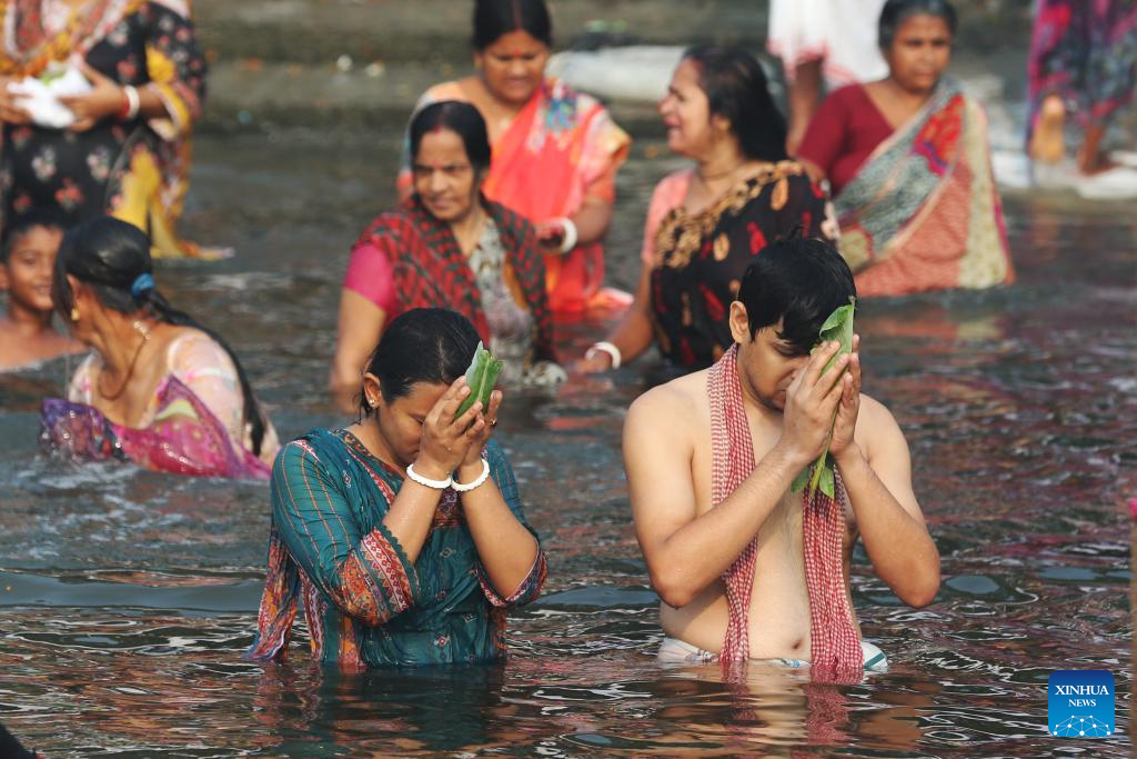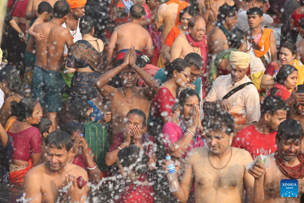 People take traditional holy bath at Brahmaputra river in Narayanganj, Bangladesh, April 5, 2025. Tens of thousands of pilgrims in Bangladesh have joined a traditional holy bath of Hindus at Brahmaputra river in Narayanganj. (Photo by Habibur Rahman/Xinhua)