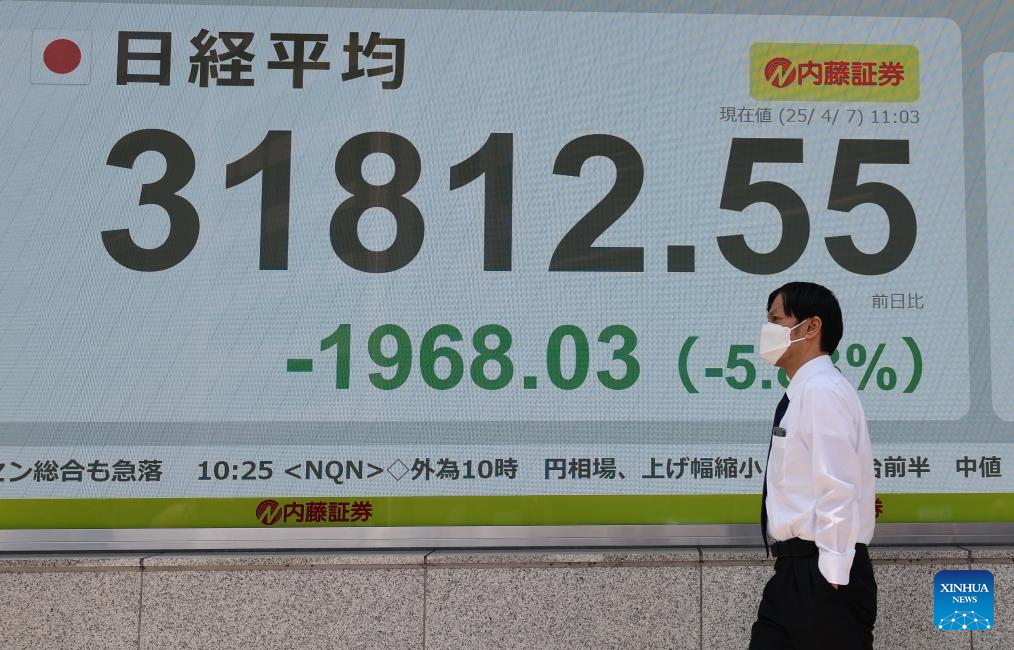 A pedestrian passes a screen showing stock market information in Tokyo, Japan, April 7, 2025. Tokyo stocks plunged early Monday with the benchmark Nikkei index briefly losing nearly 3,000 points amid growing fears of a global trade conflict triggered by U.S. tariffs. In the first 15 minutes of trading, Japan's benchmark Nikkei stock index, the 225-issue Nikkei Stock Average, shed 2,843.48 points, or 8.42 percent, from Friday to 30,937.10, the lowest intraday level since October 2023. (Xinhua/Jia Haocheng)