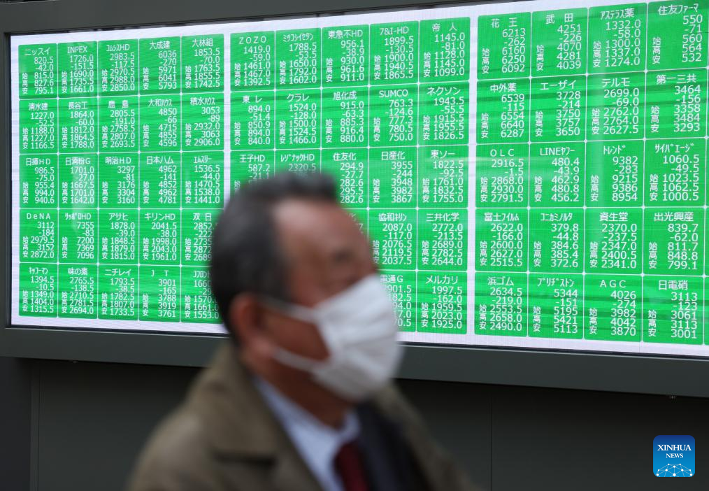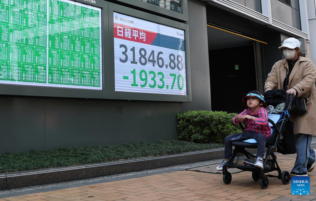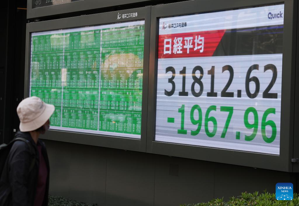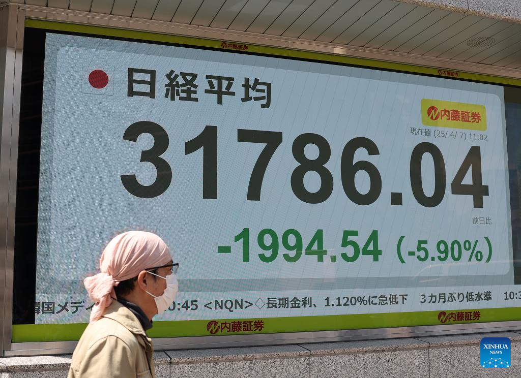 TOKYO, April 7 (Xinhua) -- Tokyo stocks plunged Monday, with the benchmark Nikkei index suffering its third-largest point drop on record, as global sell-offs continued amid intensifying fears of an all-out trade war and a global economic recession triggered by the U.S. tariffs hike.