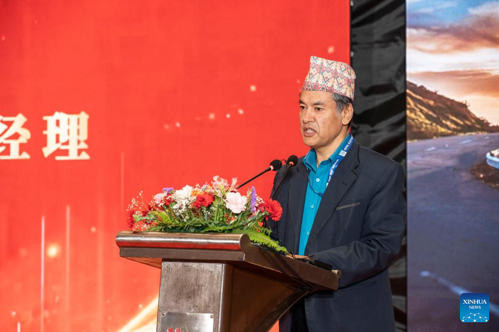 Hitendra Dev Shakya, managing director of the Nepal Electricity Authority, speaks at the launch ceremony of the Sanjen Khola hydropower station in Kathmandu, Nepal, April 9, 2025. The Sanjen Khola hydropower station in Nepal, built by a Chinese company, has been put into operation and connected to the national grid, contributing to efforts in alleviating local power shortage. (Photo by Hari Maharjan/Xinhua)