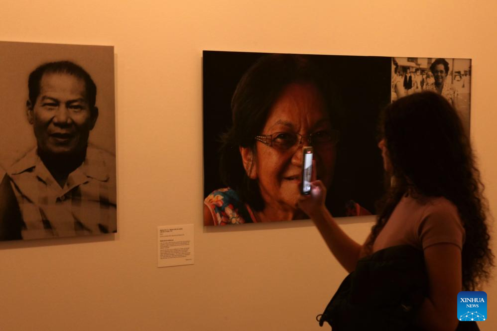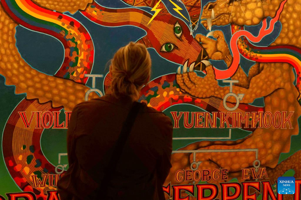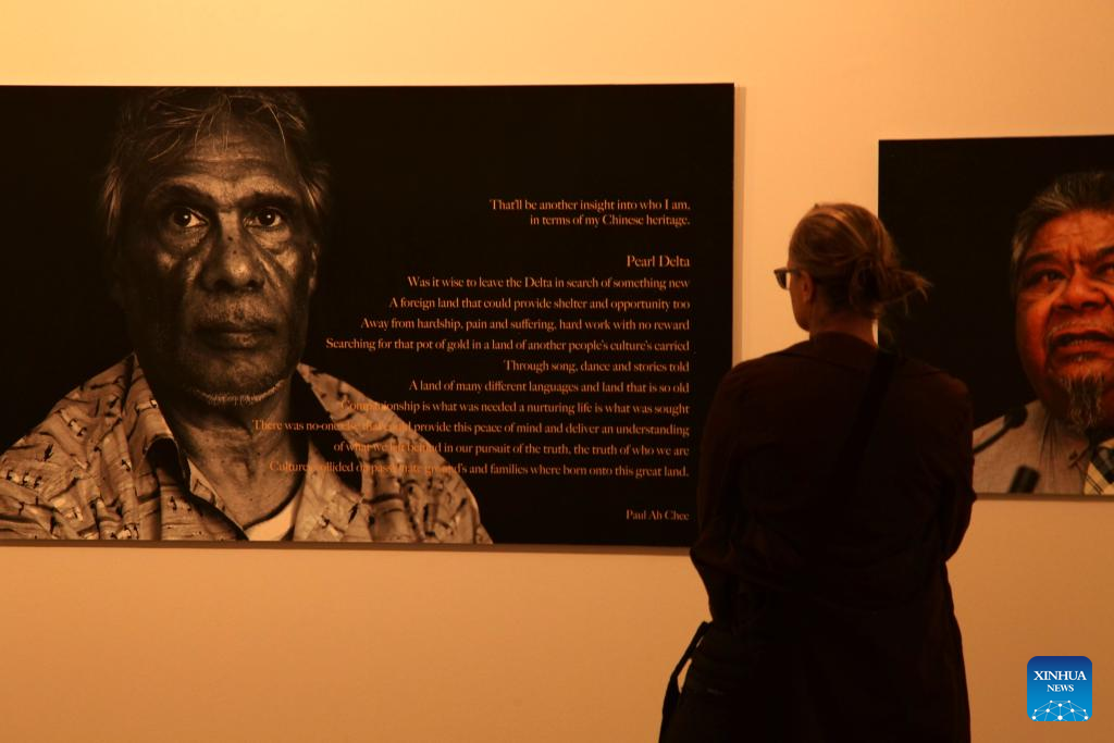 A visitor is pictured at the exhibition "Our Story: Aboriginal Chinese People in Australia" at the National Museum of Australia in Canberra, Australia, April 10, 2025. An exhibition at the National Museum of Australia is shedding light on a long-overlooked chapter of Australian history of relations between Aboriginal and Chinese people in Australia. The exhibition "Our Story: Aboriginal Chinese People in Australia," launched on Thursday, was the first of its kind and the result of a three-year research project led by artist and researcher Zhou Xiaoping, said a statement of the National Museum. (Xinhua/Zhang Jianhua)