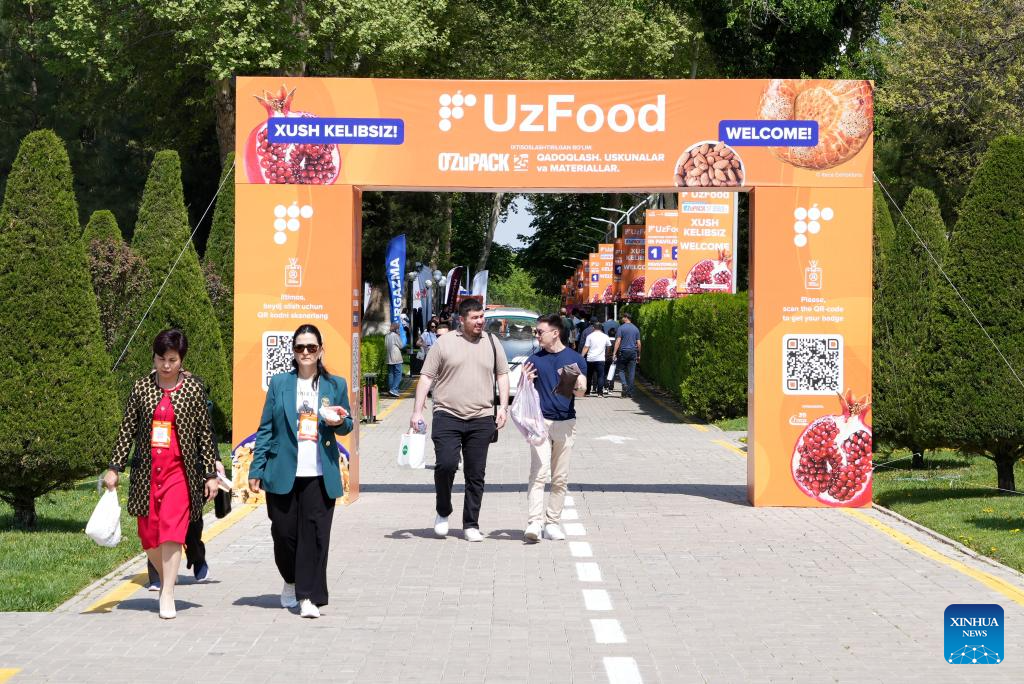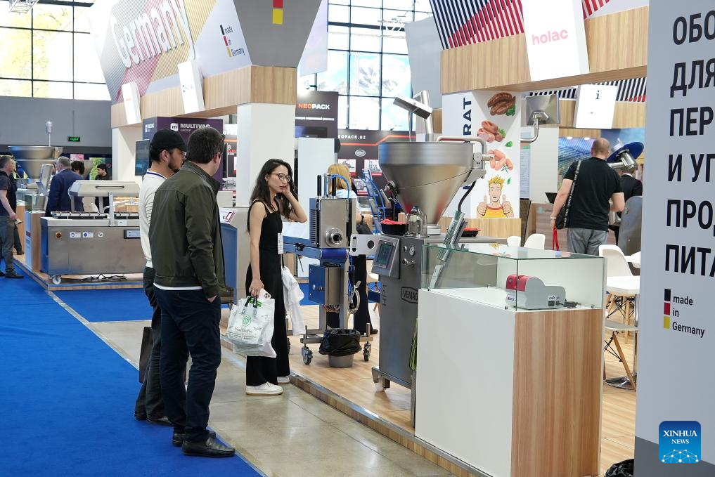 People visit the international exhibition UzFood 2025 in Tashkent, Uzbekistan, April 10, 2025. The event showcased the latest equipment and technologies for food and processing industries, packaging and storage solutions, and a wide range of food products and beverages. (Photo by Zafar Khalilov/Xinhua)