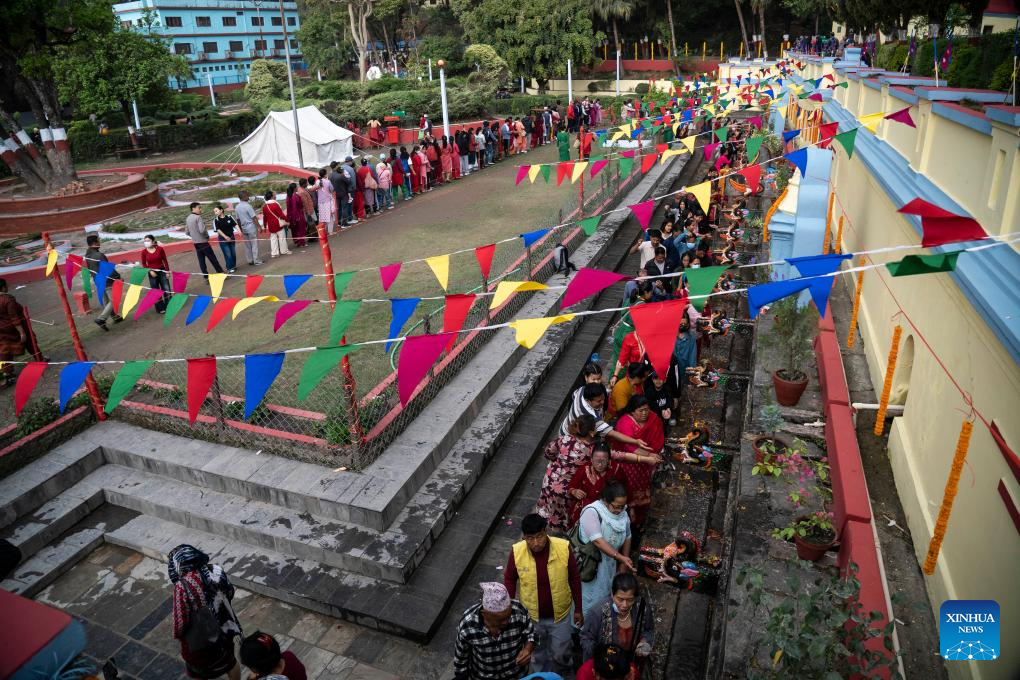 People line up to perform rituals during the Baishak Asnan festival in Kathmandu, Nepal, April 12, 2025. The locals believe that taking a holy bath on this day purifies one's spirit and makes one free from skin diseases. (Photo by Hari Maharjan/Xinhua)