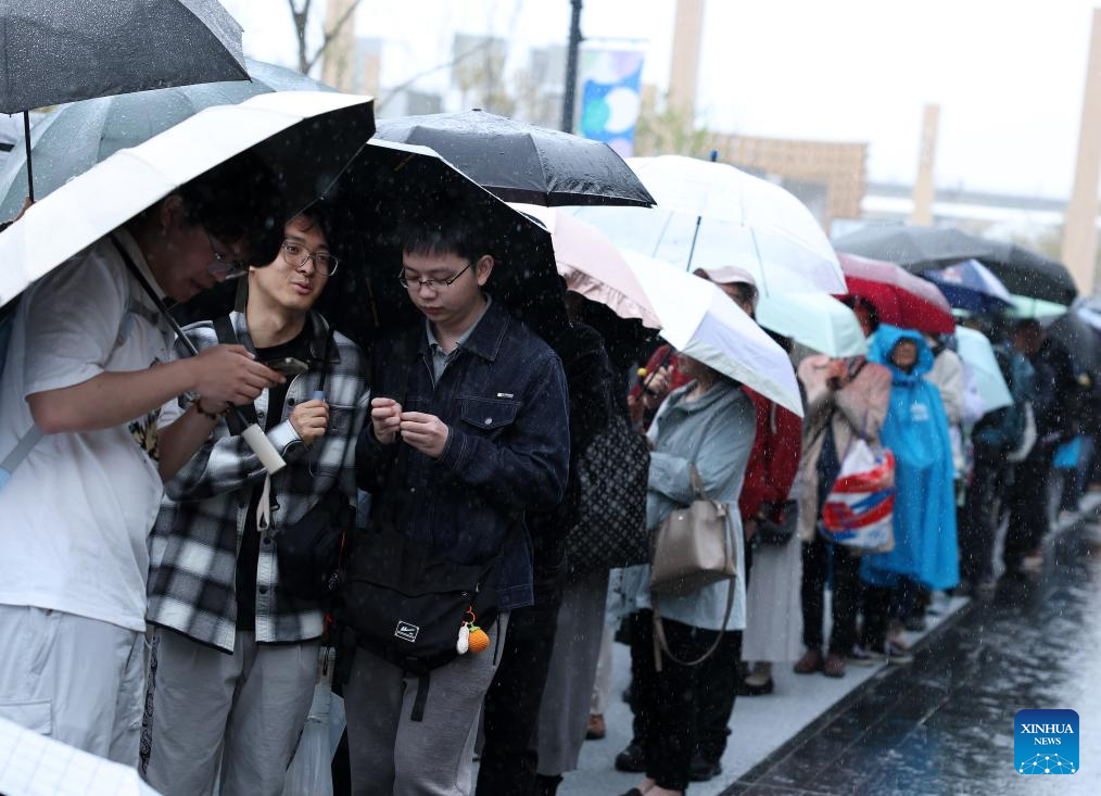 Visitors line up to enter the China Pavilion at the Osaka Expo in Osaka, Japan, April 13, 2025. The China Pavilion officially opened on Sunday at the Osaka Expo, with an opening ceremony held in front of the pavilion's main building, which is designed to resemble a traditional Chinese scroll.