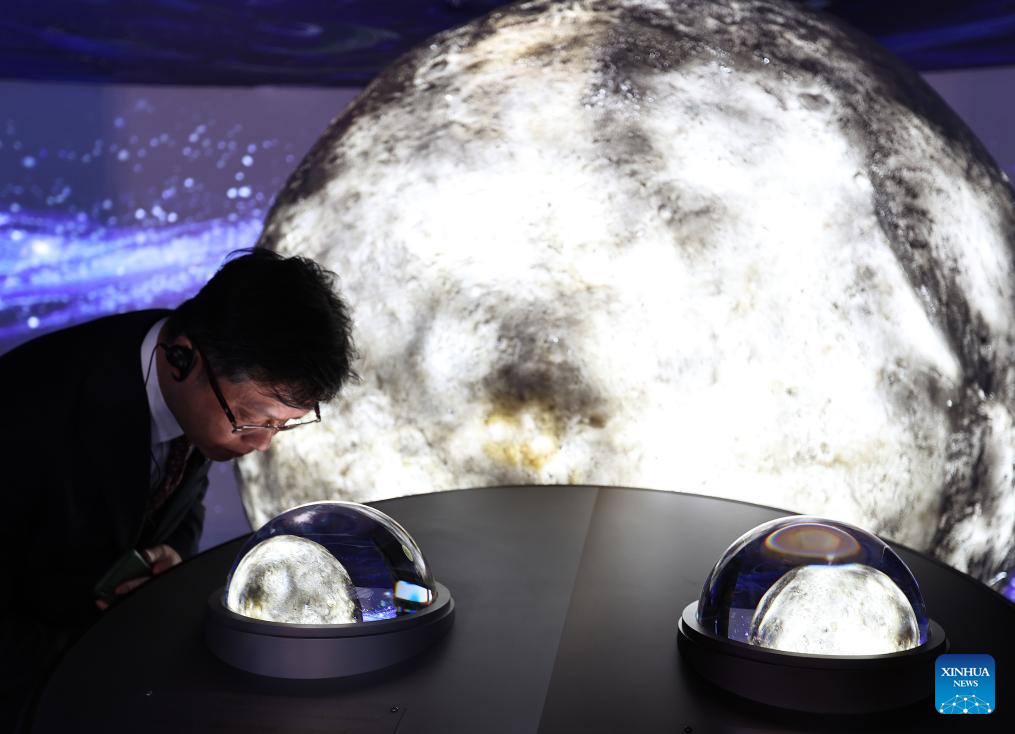 A visitors looks at lunar soil samples collected by China's Chang'e-5 and Chang'e-6 missions in the China Pavilion at the Osaka Expo in Osaka, Japan, April 13, 2025. The China Pavilion officially opened on Sunday at the Osaka Expo, with an opening ceremony held in front of the pavilion's main building, which is designed to resemble a traditional Chinese scroll.