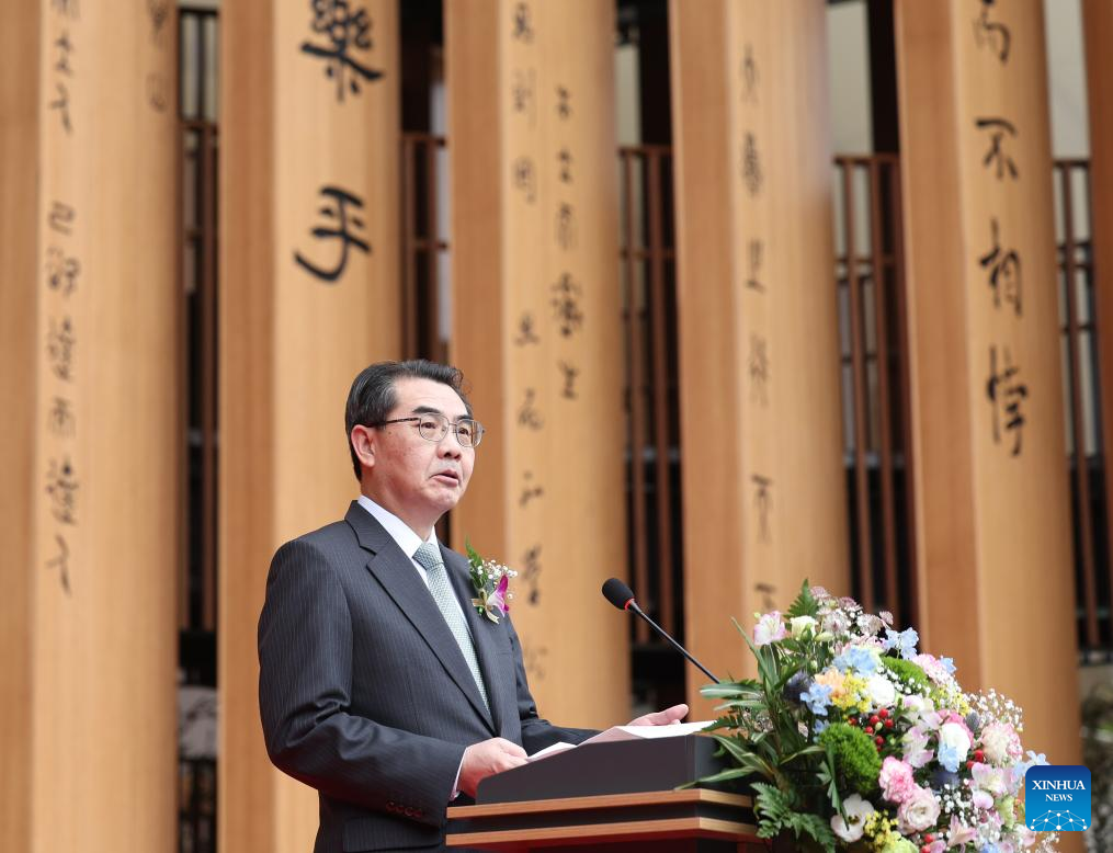 Chinese Ambassador to Japan Wu Jianghao addresses the opening ceremony of the China Pavilion at the Osaka Expo in Osaka, Japan, April 13, 2025. The China Pavilion officially opened on Sunday at the Osaka Expo, with an opening ceremony held in front of the pavilion's main building, which is designed to resemble a traditional Chinese scroll.