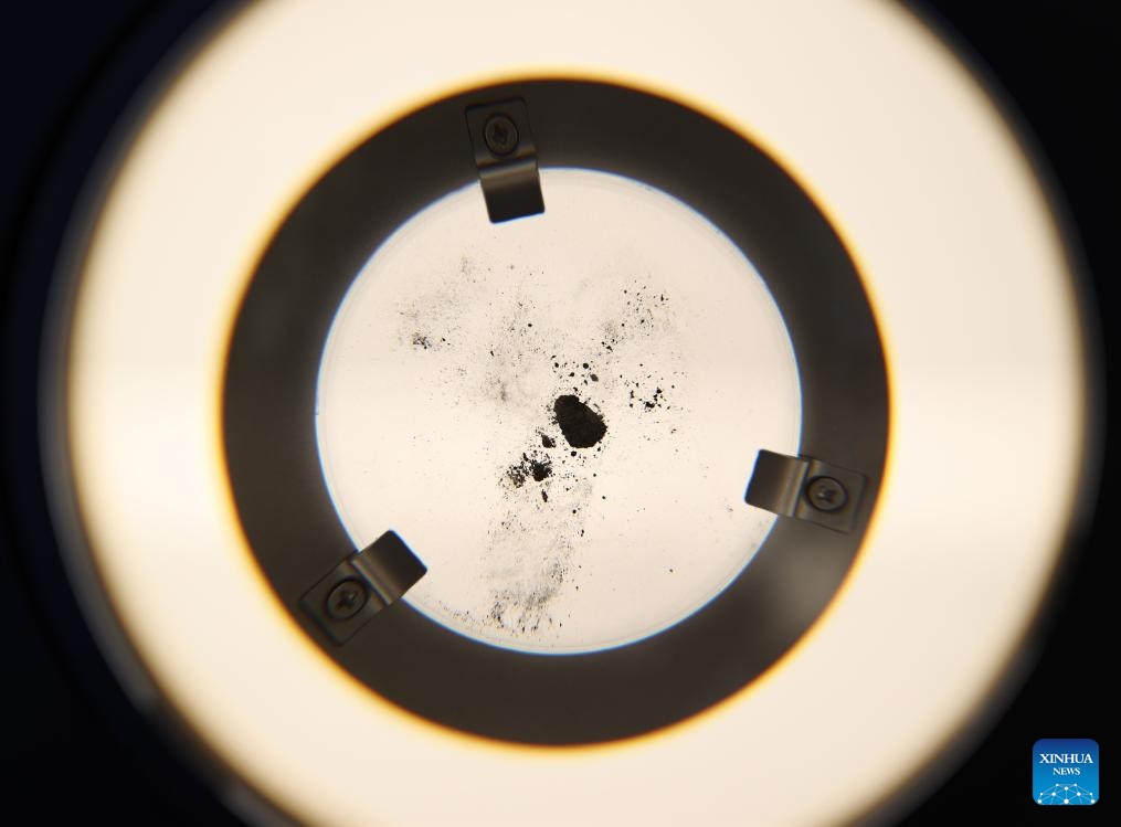 This photo taken on April 13, 2025 shows the lunar soil sample collected by China's Chang'e-5 mission displayed in the China Pavilion at the Osaka Expo in Osaka, Japan. The China Pavilion officially opened on Sunday at the Osaka Expo, with an opening ceremony held in front of the pavilion's main building, which is designed to resemble a traditional Chinese scroll.