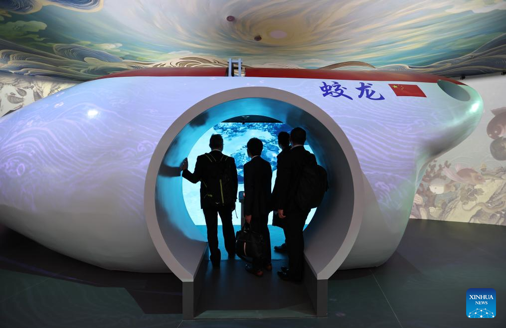 People visit the "Jiaolong" deep-sea submersible experience capsule in the China Pavilion at the Osaka Expo in Osaka, Japan, April 13, 2025. The China Pavilion officially opened on Sunday at the Osaka Expo, with an opening ceremony held in front of the pavilion's main building, which is designed to resemble a traditional Chinese scroll.
