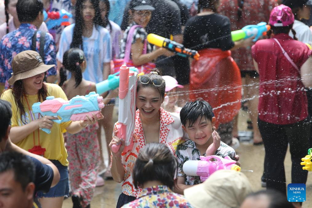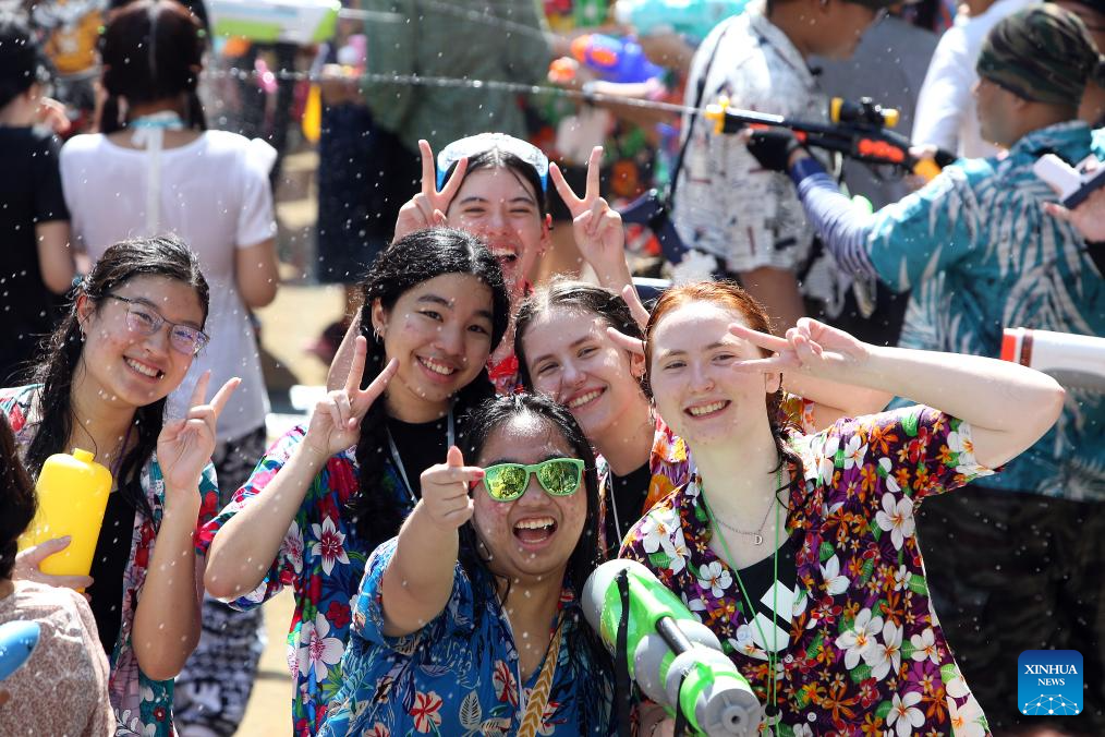 People pose for photos during a celebration of the Songkran festival in Bangkok, Thailand, April 13, 2025. Songkran, a traditional Thai New Year festival, is celebrated from April 13 to 15 every year, during which people express greetings by splashing water on each other. (Xinhua/Rachen Sageamsak)