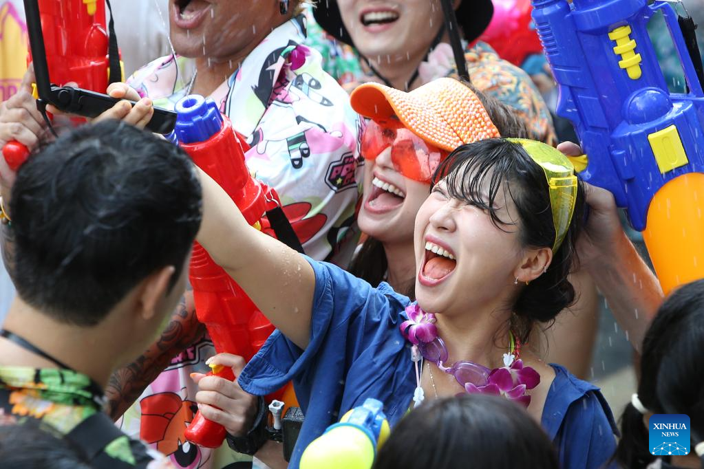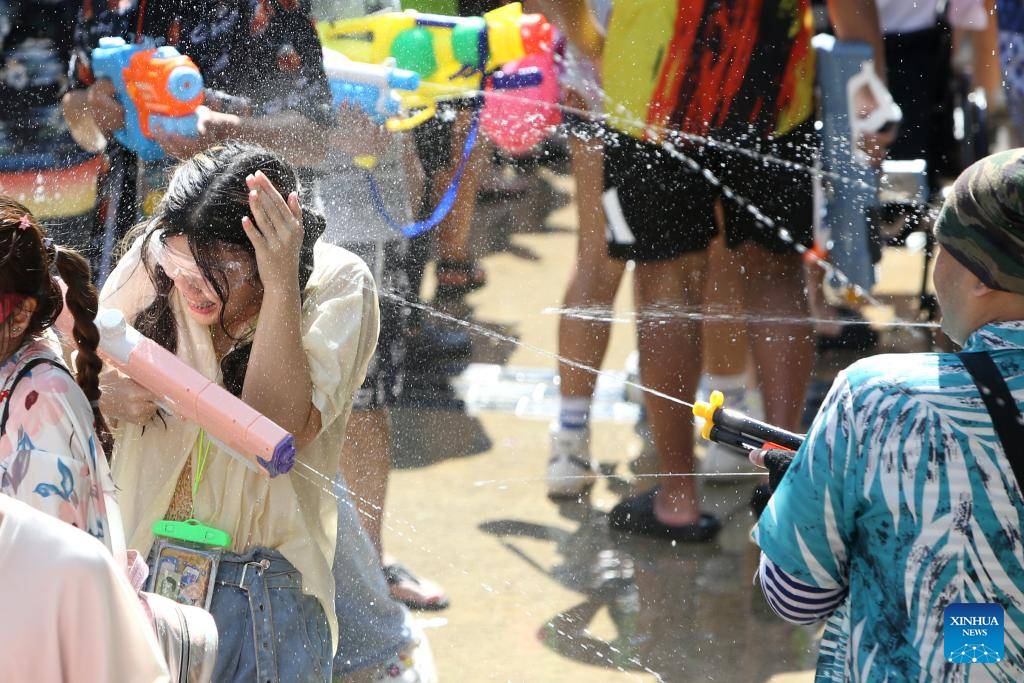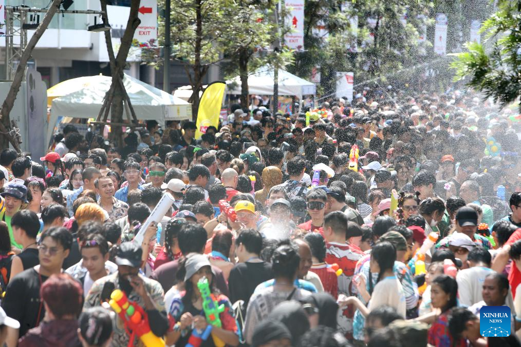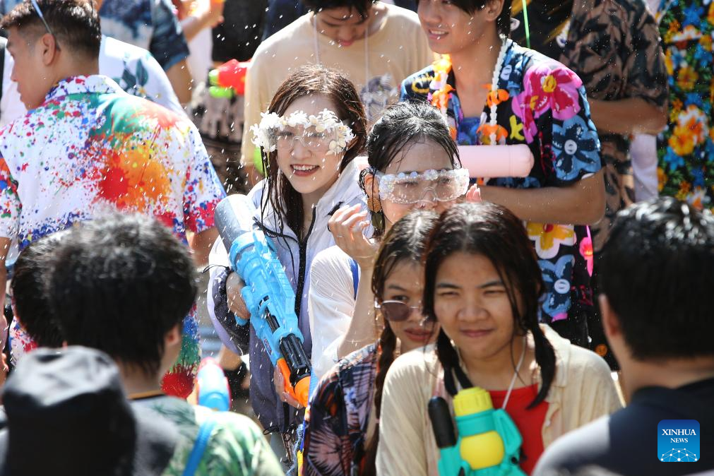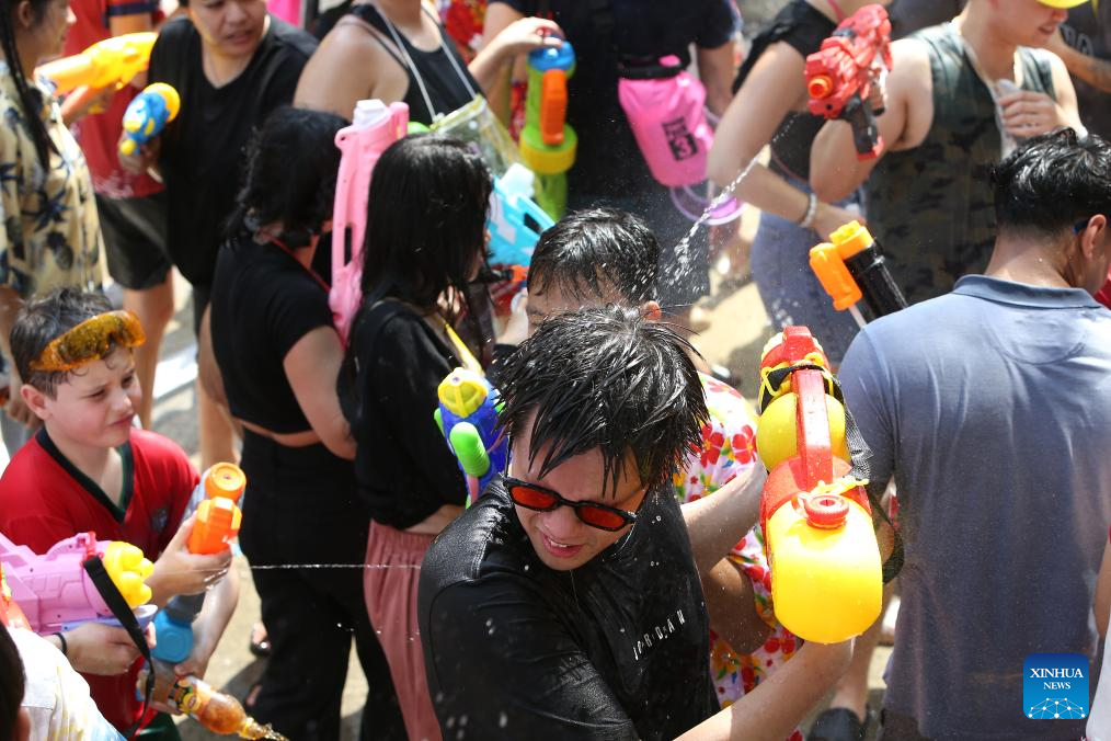 People splash water on one another in celebration of the Songkran festival in Bangkok, Thailand, April 13, 2025. Songkran, a traditional Thai New Year festival, is celebrated from April 13 to 15 every year, during which people express greetings by splashing water on each other. (Xinhua/Rachen Sageamsak)