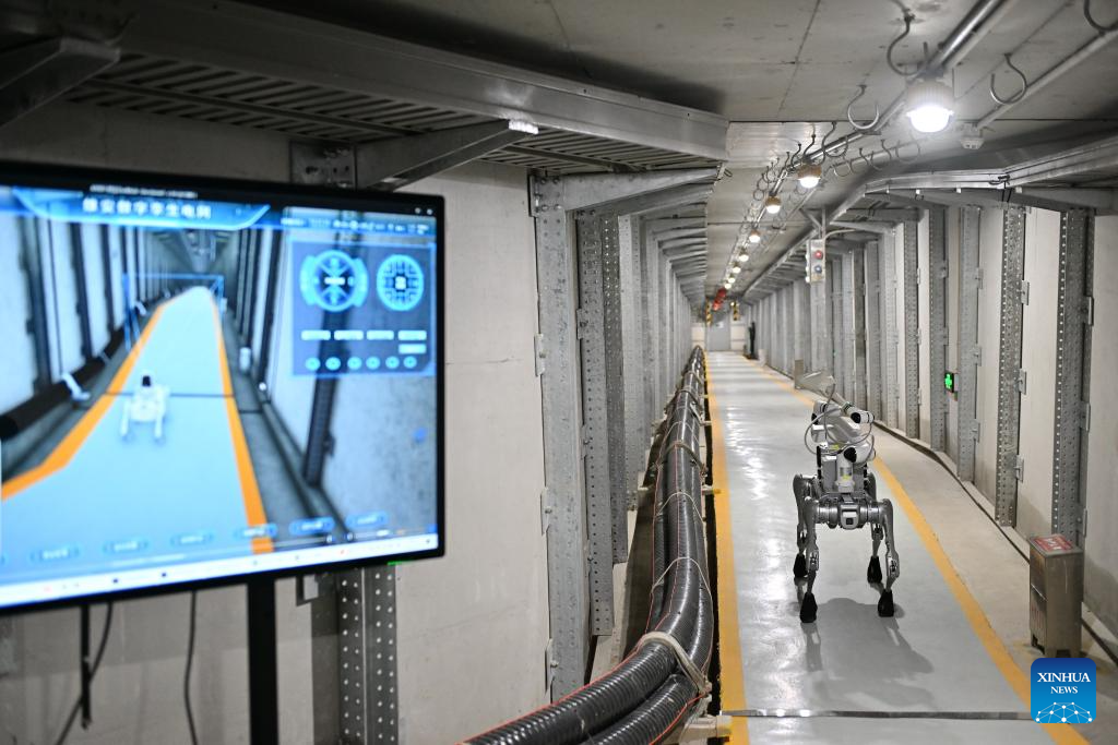 A robot conducts inspection work at a cable tunnel in Xiong'an New Area, north China's Hebei Province, April 15, 2025. In recent years, the local power sector of Hebei has been promoting power grids construction of Xiong'an New Area in accordance with the standards of first-tier cities in China. Under the concept of green, innovative and smart development, the construction of electrical substations would be integrated with urban landscape design, and many intelligent power projects have been finished. (Xinhua/Mu Yu)