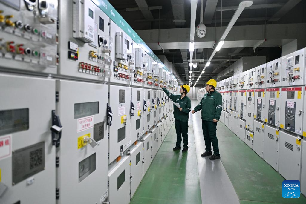 Staff members of State Grid Xiong'an New Area Power Supply Company record operating parameters of equipment at an electrical substation in Xiong'an New Area, north China's Hebei Province, April 15, 2025. In recent years, the local power sector of Hebei has been promoting power grids construction of Xiong'an New Area in accordance with the standards of first-tier cities in China. Under the concept of green, innovative and smart development, the construction of electrical substations would be integrated with urban landscape design, and many intelligent power projects have been finished. (Xinhua/Mu Yu)