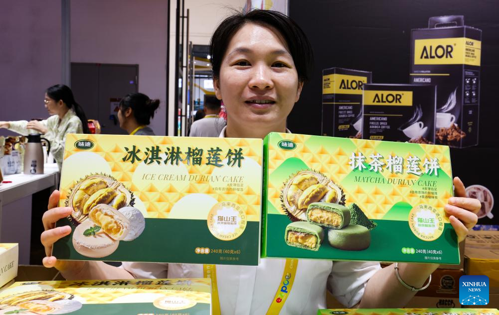 An exhibitor shows food products made from Malaysian durian at the 5th China International Consumer Products Expo (CICPE) in Haikou, south China's Hainan Province, April 15, 2025. (Xinhua/Yang Guanyu)