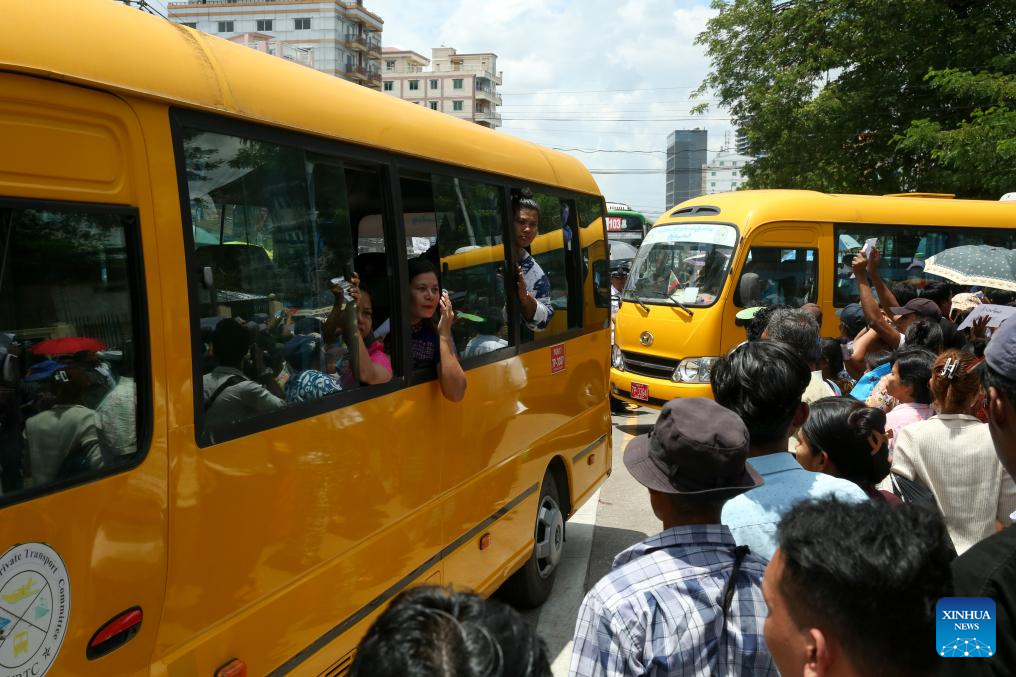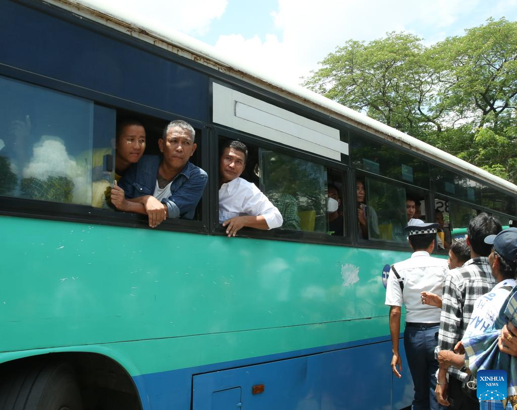 Buses carrying prisoners who have been granted pardons leave the Insein Prison in Yangon, Myanmar, April 17, 2025. Myanmar's State Administration Council pardoned over 4,900 prisoners in an amnesty on Thursday, the first day of the Myanmar calendar New Year. (Xinhua/Myo Kyaw Soe)